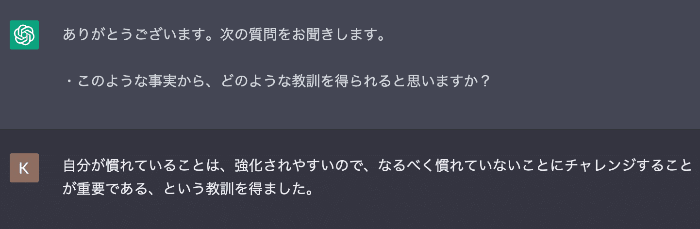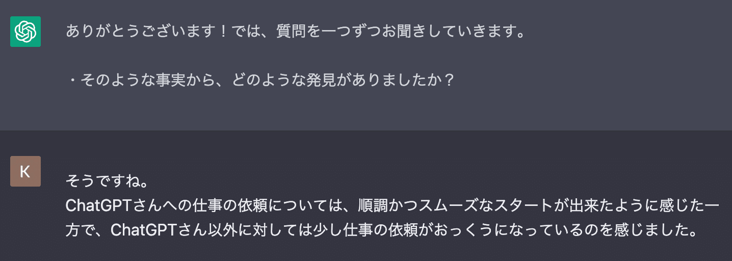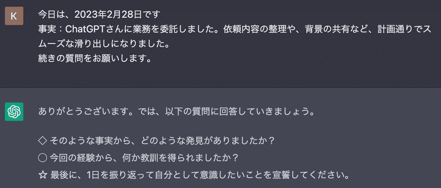 一日の振り返りをする時にも同じことが言えます。例えば、一番最初のこの会話。文章の最後に「質問は、一度にひとつづつでお願いします。」と入力しています。