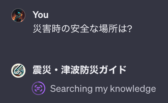 質問をすると、以下のような表示がされ 製作者が事前に与えた情報を「震災・津波防災ガイド」GPTが検索し、その情報を基に回答が行われます。