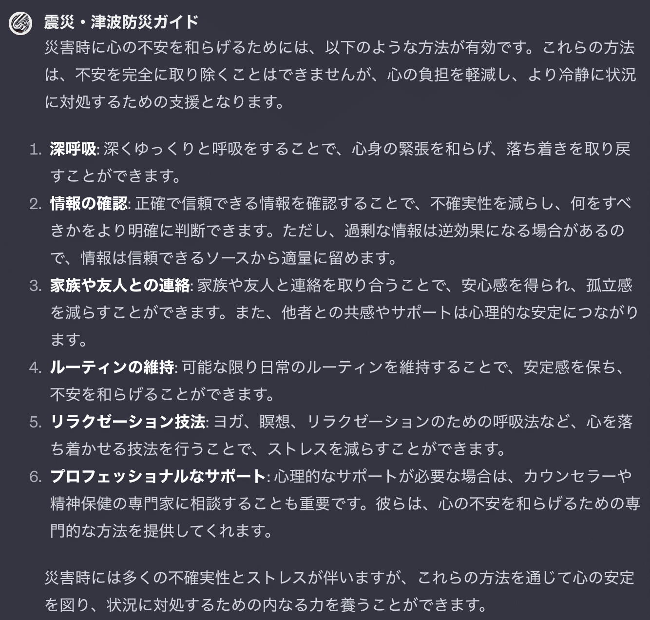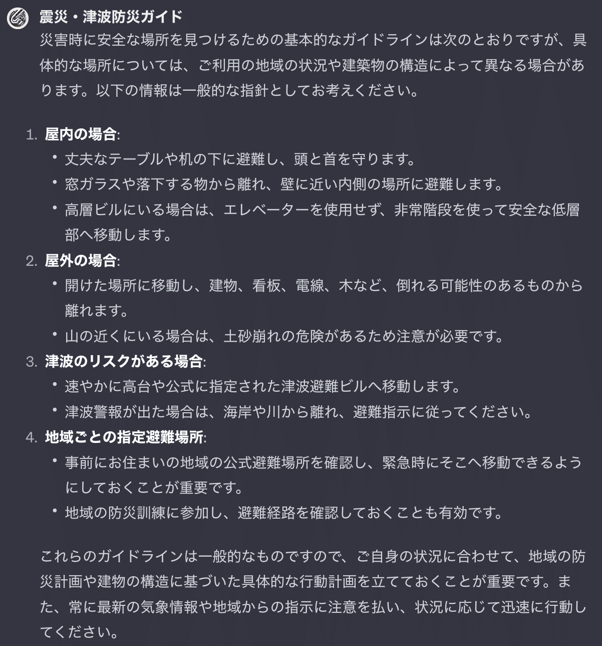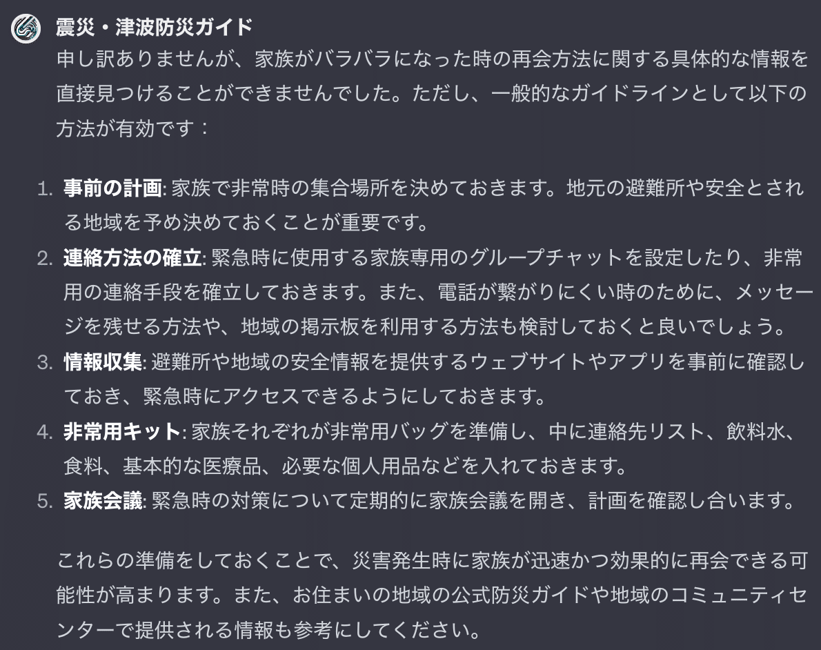 このGPTは災害時に必要な具体的な行動指針を教えてくれたり、