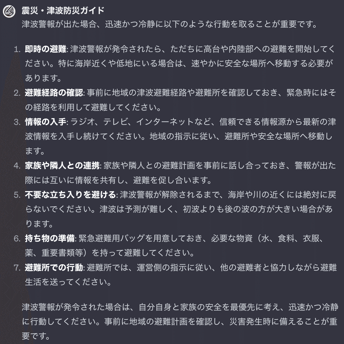 以下、「震災・津波防災ガイド」GPTの回答: