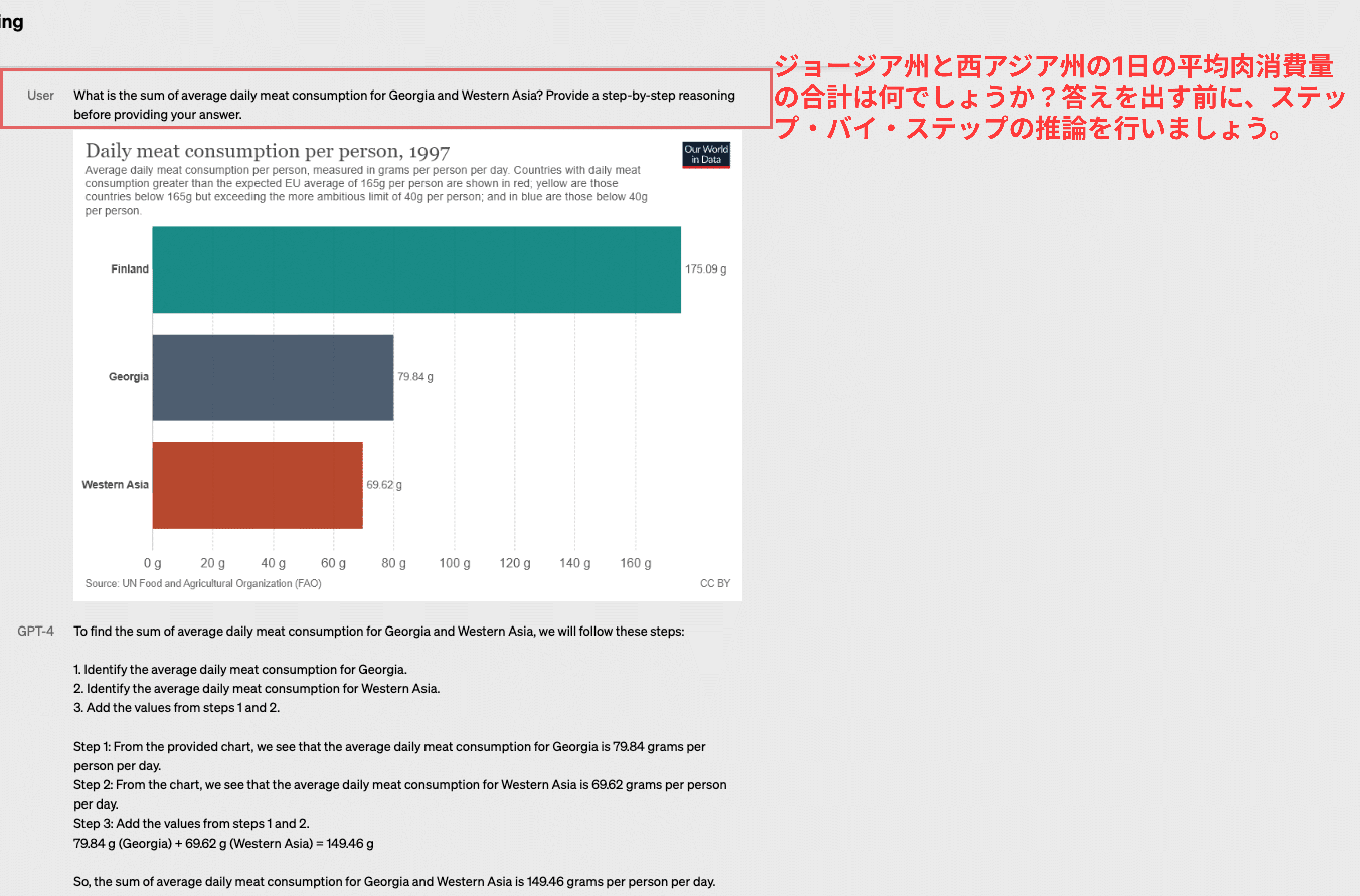 GPT-4: ジョージアと西アジアの平均的な1日の肉摂取量の合計を求めるために、以下の手順に従います: