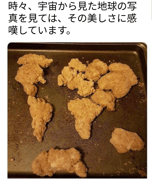 ミームのテキストでは、下の画像は宇宙から見た地球の美しい写真であるかのように書かれています。しかし、実際にはチキンナゲットを世界地図に似せて並べたものである。
