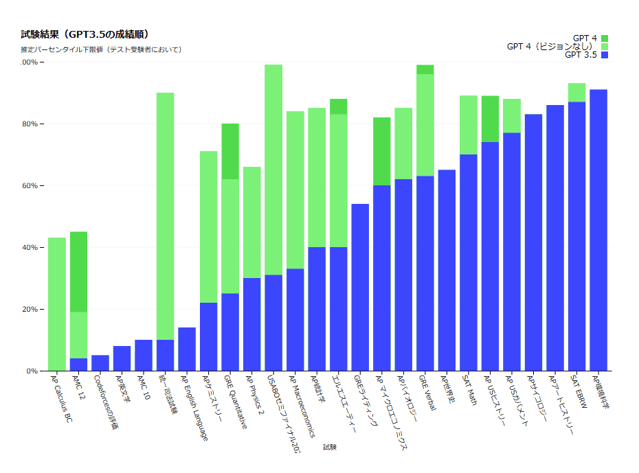 特に結果が顕著に現れたのは、司法試験で、GPT-3.5の結果は下から10%の成績だったに対し、GPT-4は上位から10%の成績を収めています。