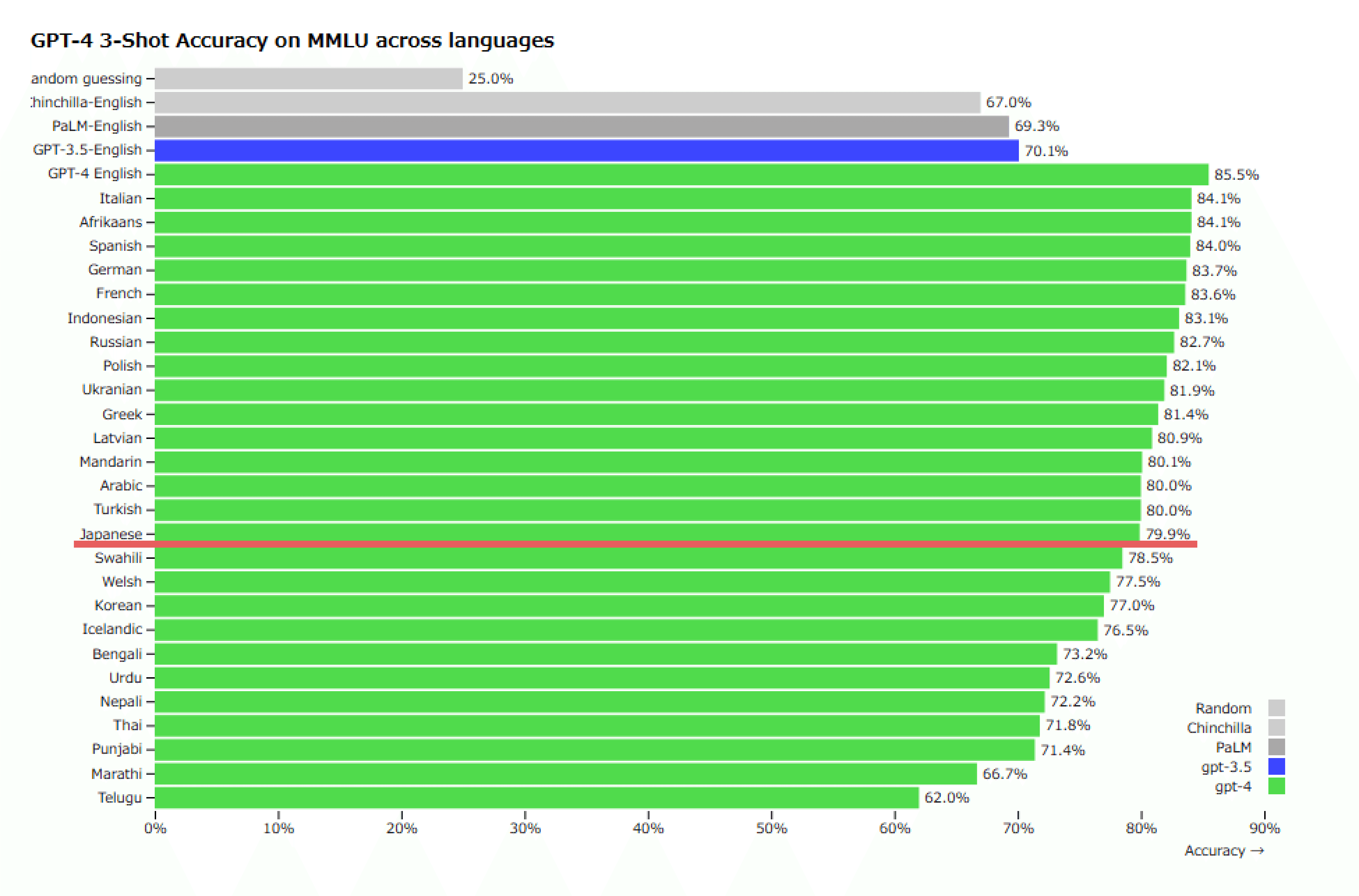 GPT-4はGPT-3.5や他のLLM(Chinchilla、PaLM)の英語パフォーマンスを上回り、ラトビア語、ウェールズ語、スワヒリ語などのリソースが少ない言語でも優れた性能を発揮しています。また、私たちの日本語でも非常に高い結果を出しています。