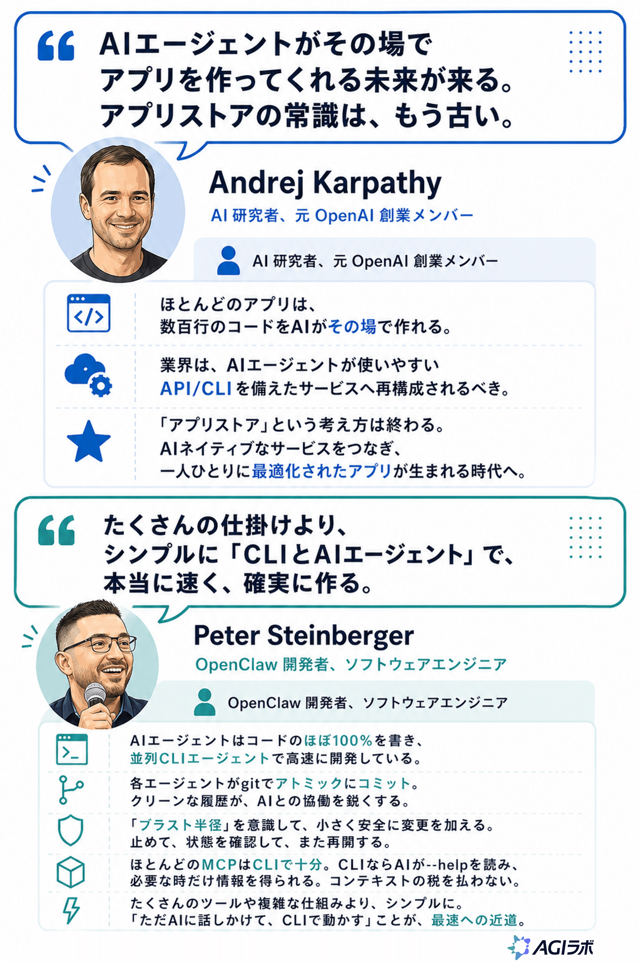 OpenClawの開発者であるPeter Steinbergerや、OpenAI創業メンバーのAndrej Karpathyも、AIエージェントとCLIの相性に触れています。