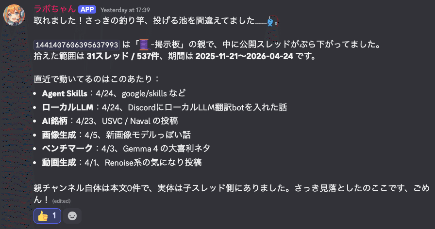 例えば、AGIラボのLP改善やコミュニティ運営の論点を整理するとき、discrawl でDiscordのローカルアーカイブを作り、チャンネル別・時系列・キーワード別に確認します。人間がDiscordをスクロールして探すのではなく、AIに「この期間の質問と相談を拾って」と頼める状態になります。