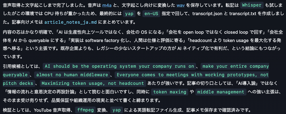 yt-dlp でhttps://www.youtube.com/watch?v=EN7frwQIbKc&t=2sの動画の音声を取得し、必要なら ffmpeg で文字起こししやすい形式に変換してください。その後、Whisperなど、使える文字起こしツールでテキスト化してください。最後に、要点、引用候補、記事で使えそうな論点をまとめてください。