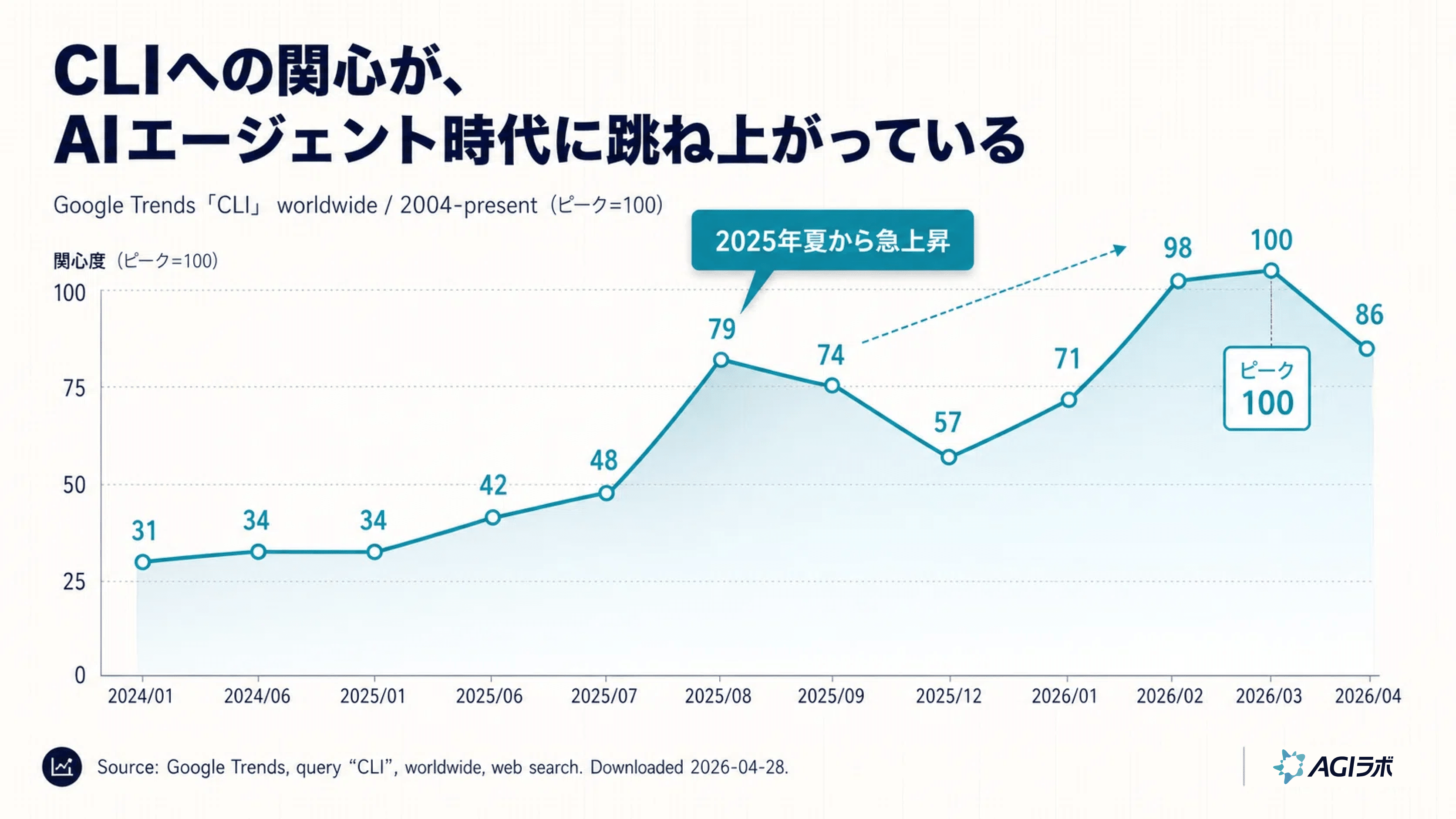 実際、Google Trendsで「CLI」を見ると、2024年は30台だった検索関心が、2025年夏から大きく伸びています。2026年3月には、2004年以降の期間内ピークである100に到達しています。