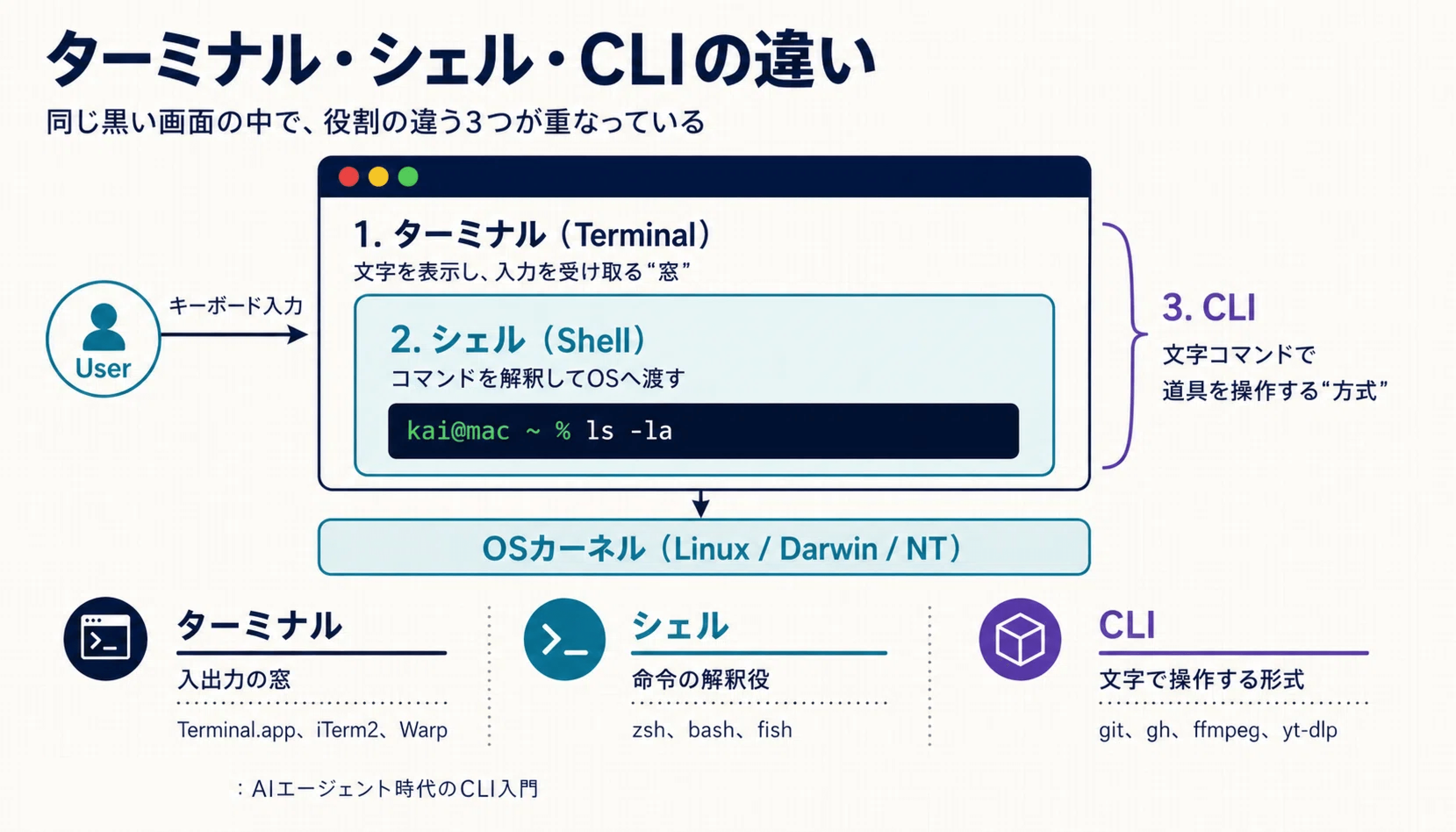ターミナル: 文字を表示し、キーボード入力を受け取るアプリです。macOSのターミナル.app、iTerm2、Warp、Ghosttyなどがこれに当たります。