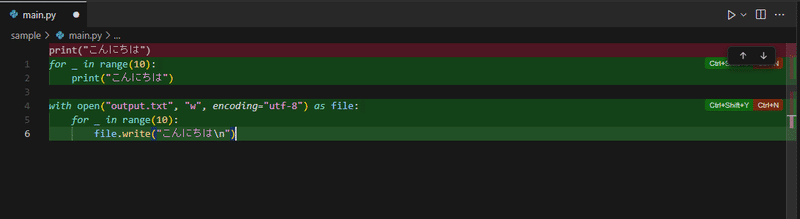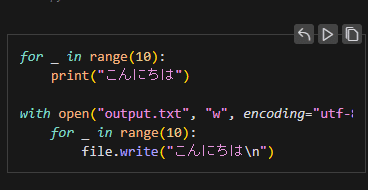 それでは次に、こんにちはと10回出力した後にすべてテキストファイルに保存するプログラムを書いてもらいましょう。