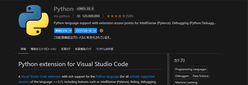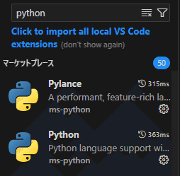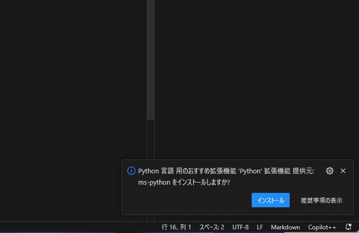 右下にpython言語の拡張機能が出ている場合はインストールをクリック
