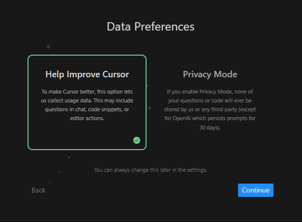左のHelp Improve CursorはCursorにコードやチャット履歴などの利用データを送信することになるので、おすすめはチャット履歴やコードを送信しないPrivacyモードです。