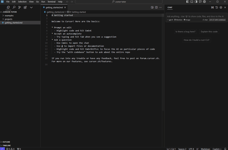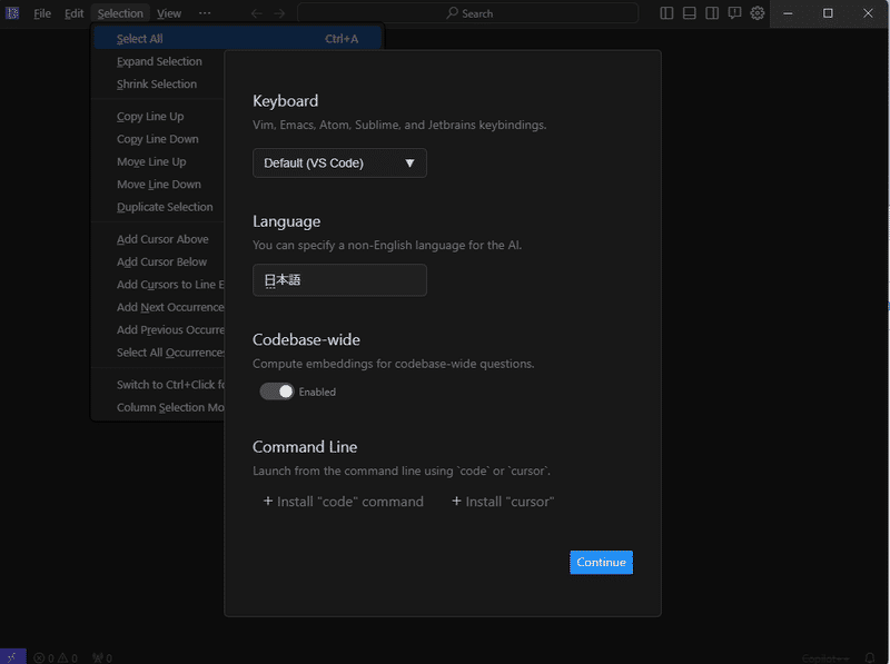 そしてインストールされたCursorを開くと次のような画面が出てきます。