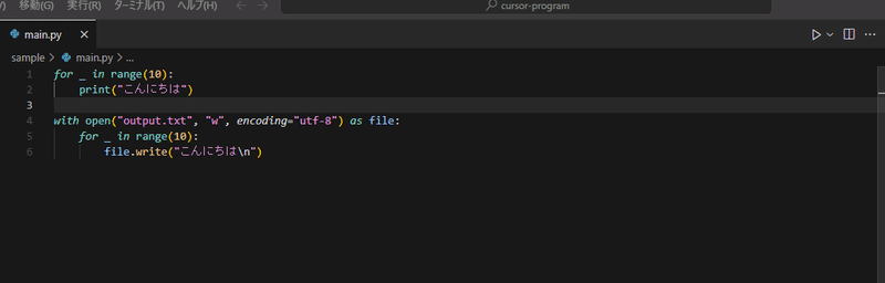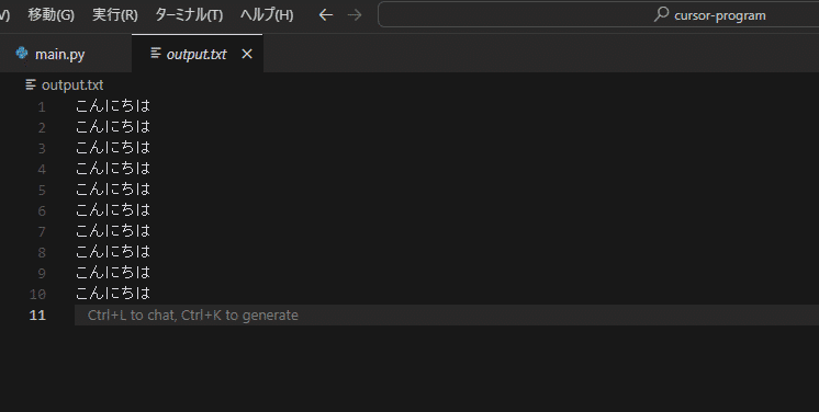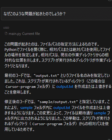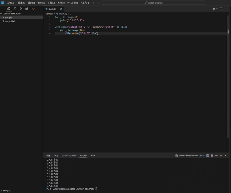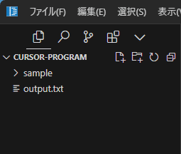 しかし、実行したmain.pyのあるsampleフォルダの上のCursor-programフォルダにoutput.txtが入ってしまっていますね。