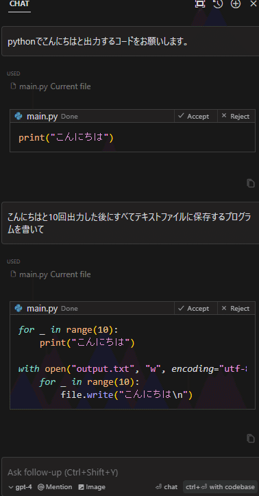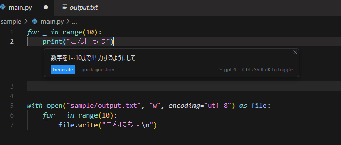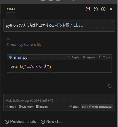「pythonでこんにちはと出力するコードをお願いします。」と入力して送信してみましょう。