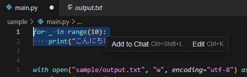 今回はsampleフォルダの中にmain.pyを作成し、その中で開発を行っていきます。