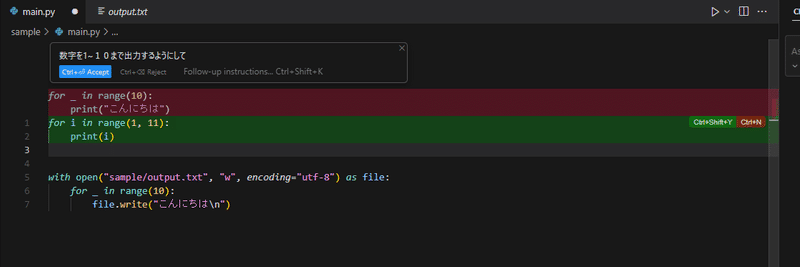 コードを出力してくれました。これまでと同様に、Apply→Continue→Ctrl+Shift+Yで承認の流れで変更できます。