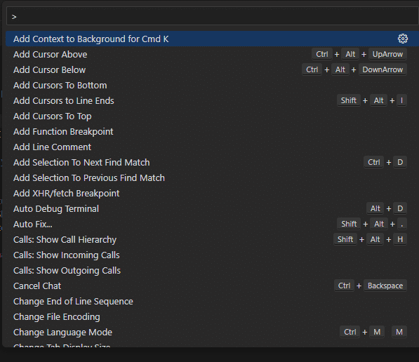 Windowsの場合はCtrl+Shift+Pを、Macの場合⇧ + ⌘ + Pを押すとこのような画面が開きます。