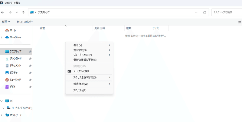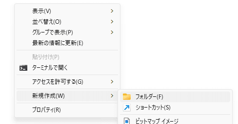 今回はデスクトップフォルダを開き、右クリックで新規作成で作成しています。