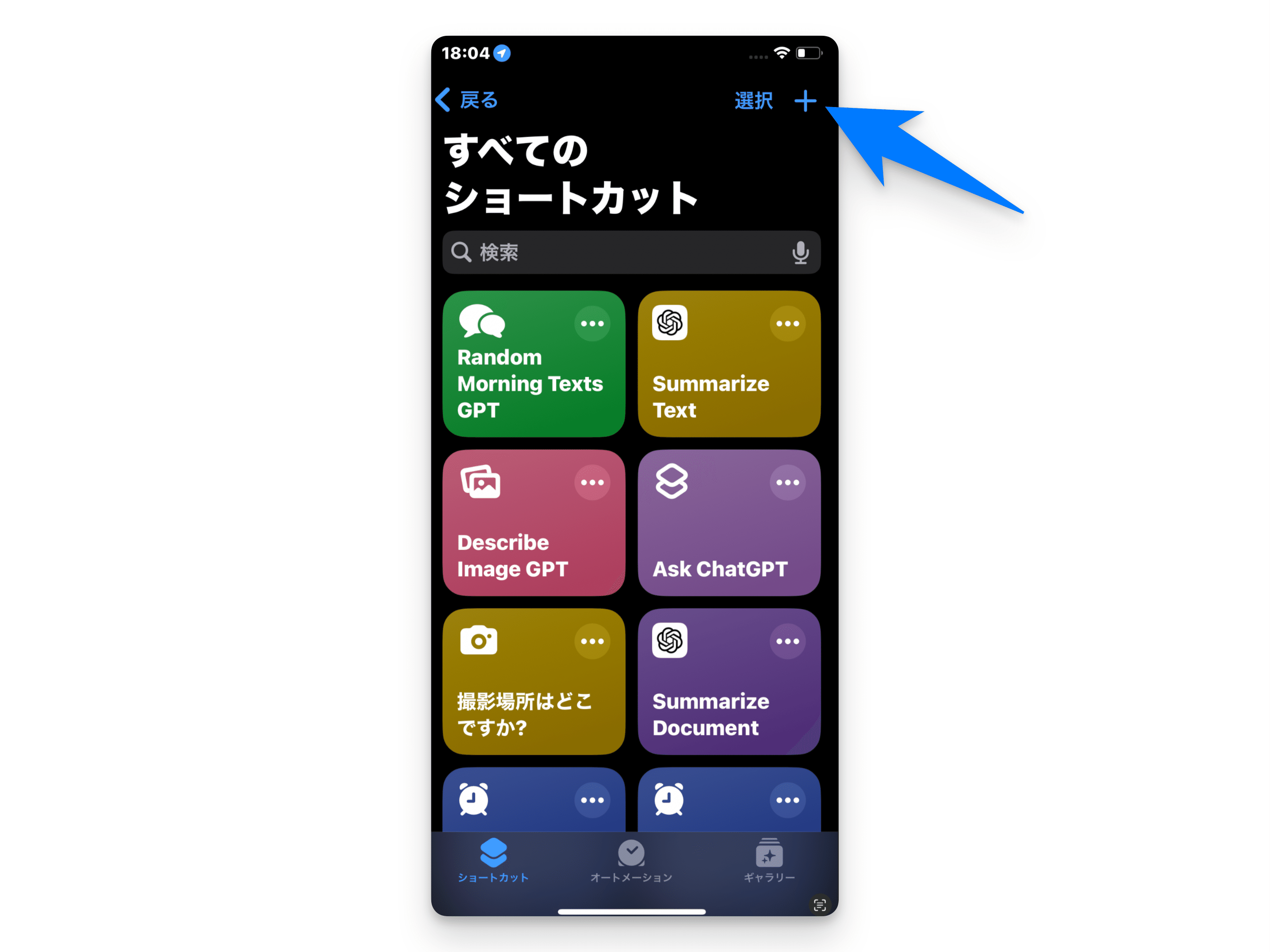 ②「+」ボタンをタップして、新しいショートカットを作成する。