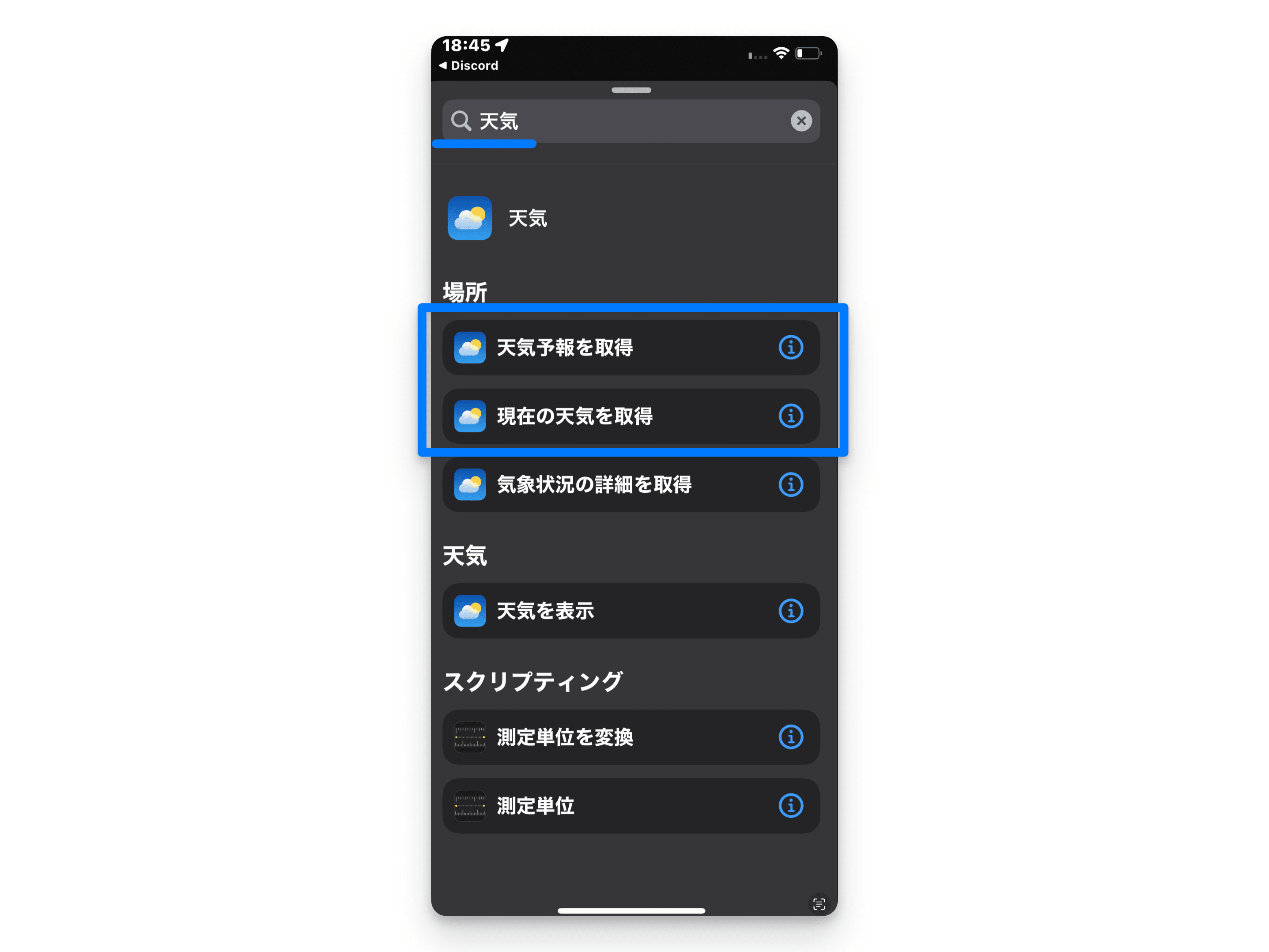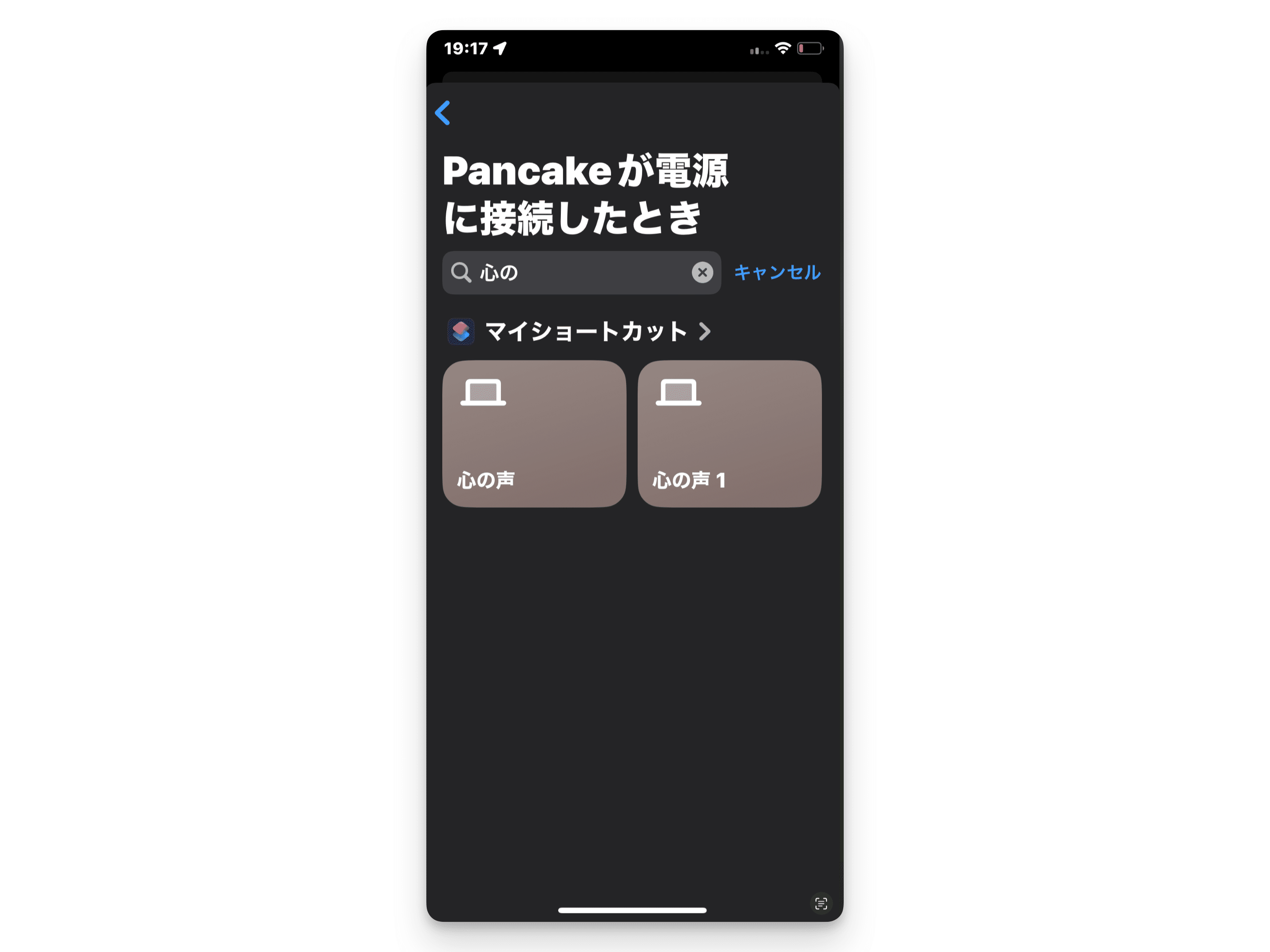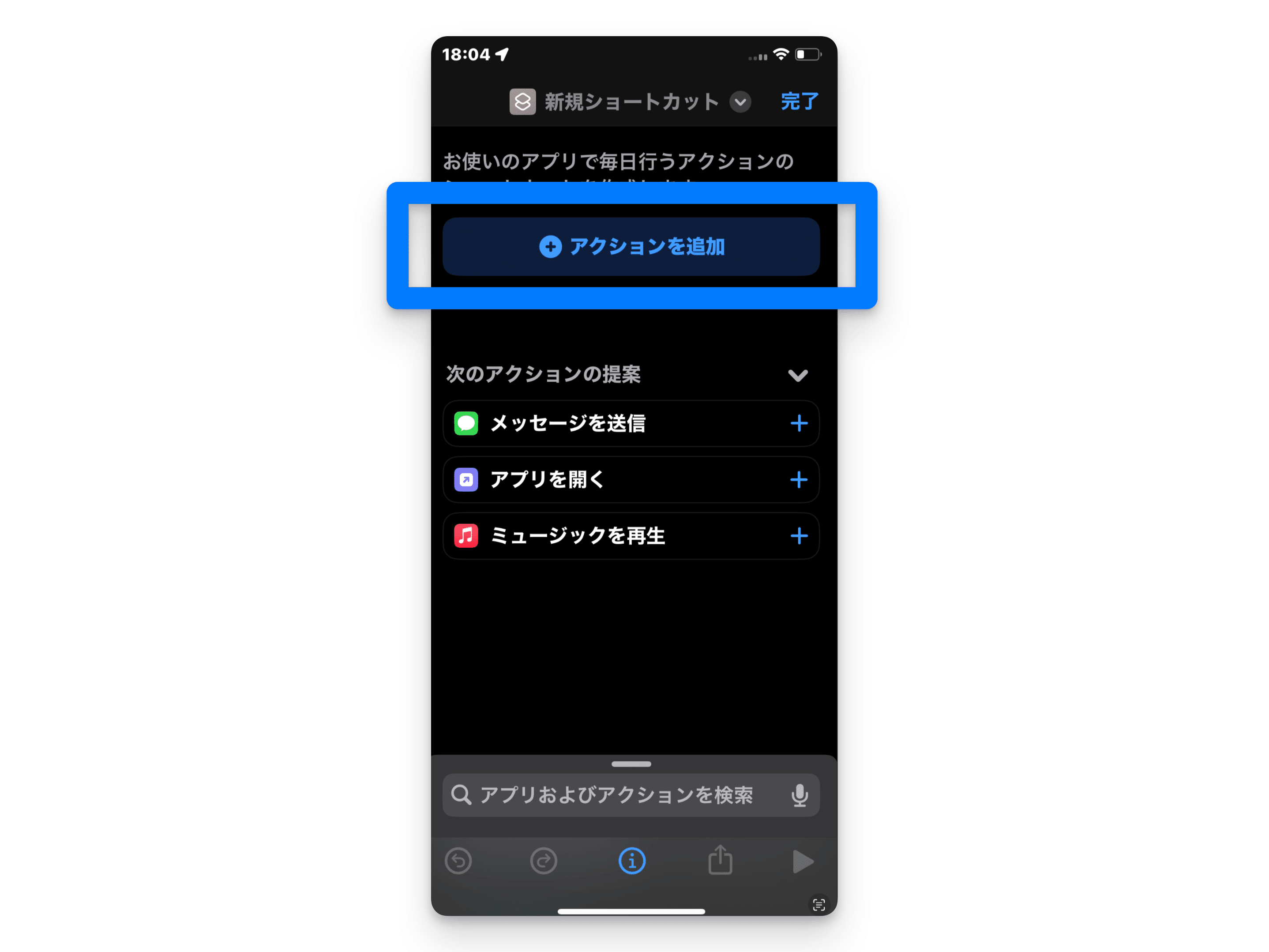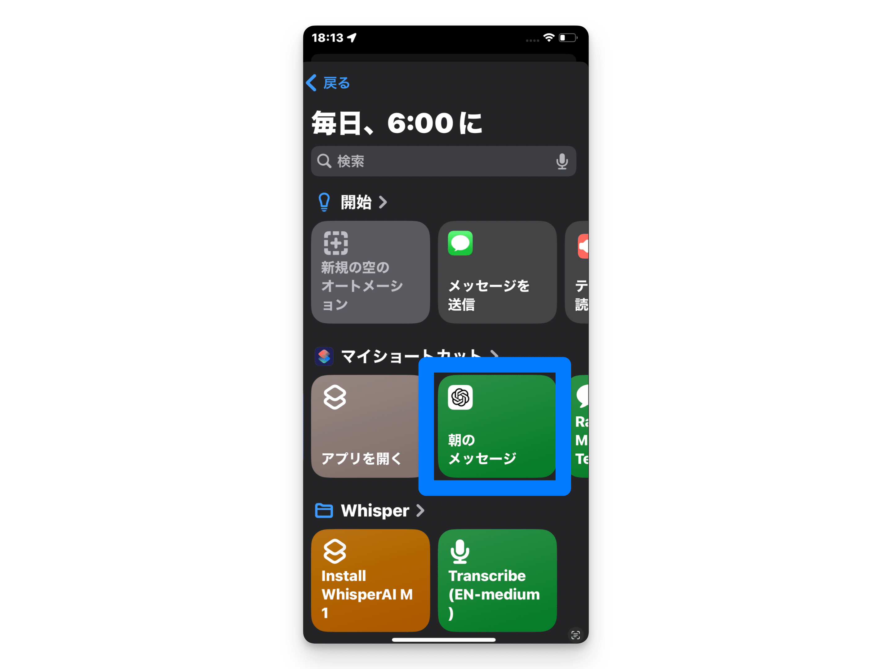 検索バーに「朝のメッセージ」と入力、または「マイショートカット」から、先ほど追加したショートカットを選択します。