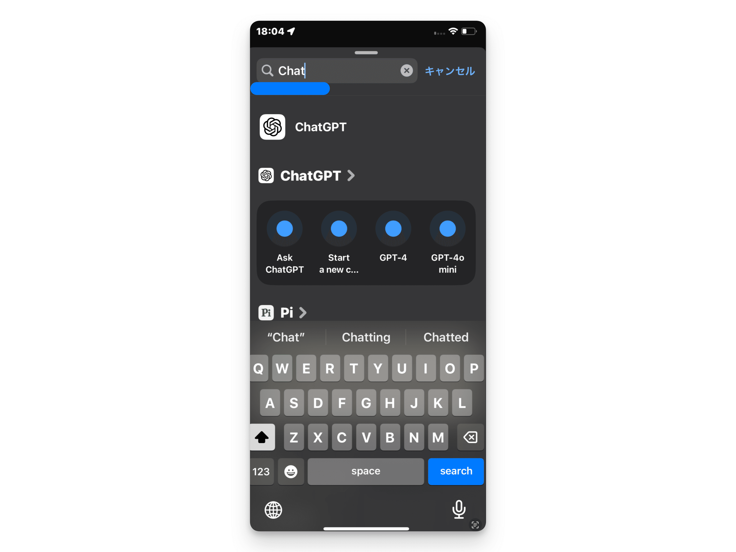 ショートカットの作成画面で、アクションを追加する際に「ChatGPT」と検索すると、ChatGPTと連携するためのアクションが表示されます。