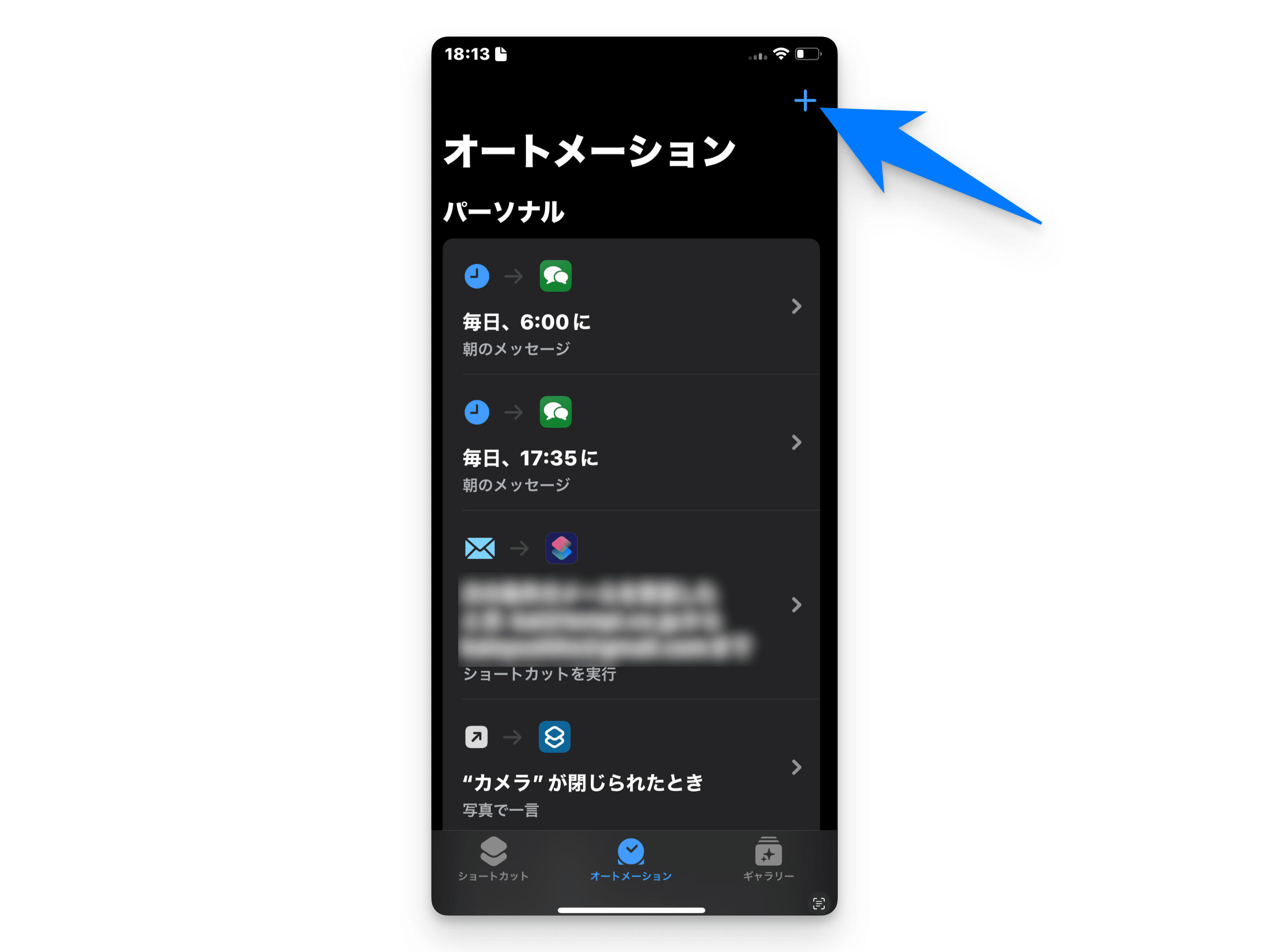 画面右上の「+」ボタンをタップし、「個人用オートメーションを作成」を選択します。