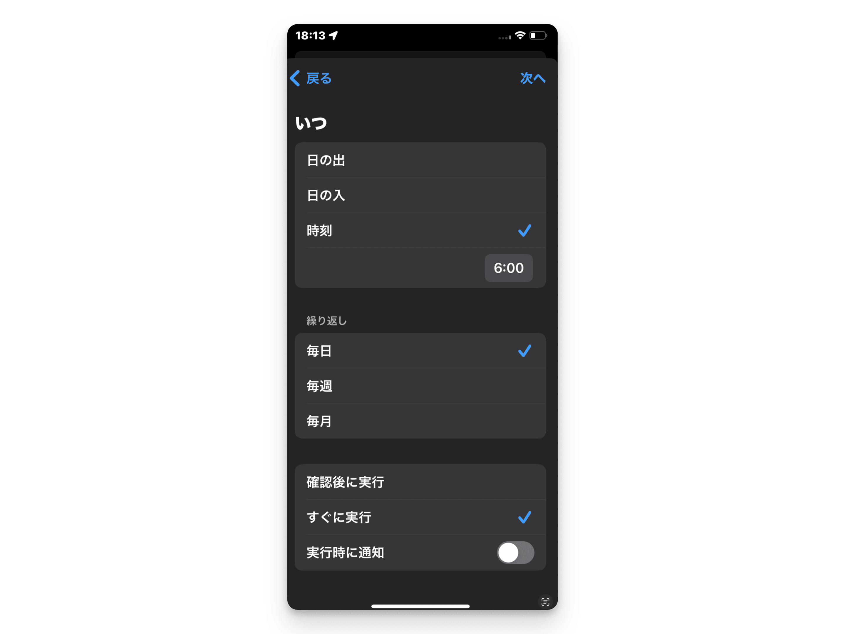 「すぐに実行」を選択します。「実行時に通知」はオフのままにします。