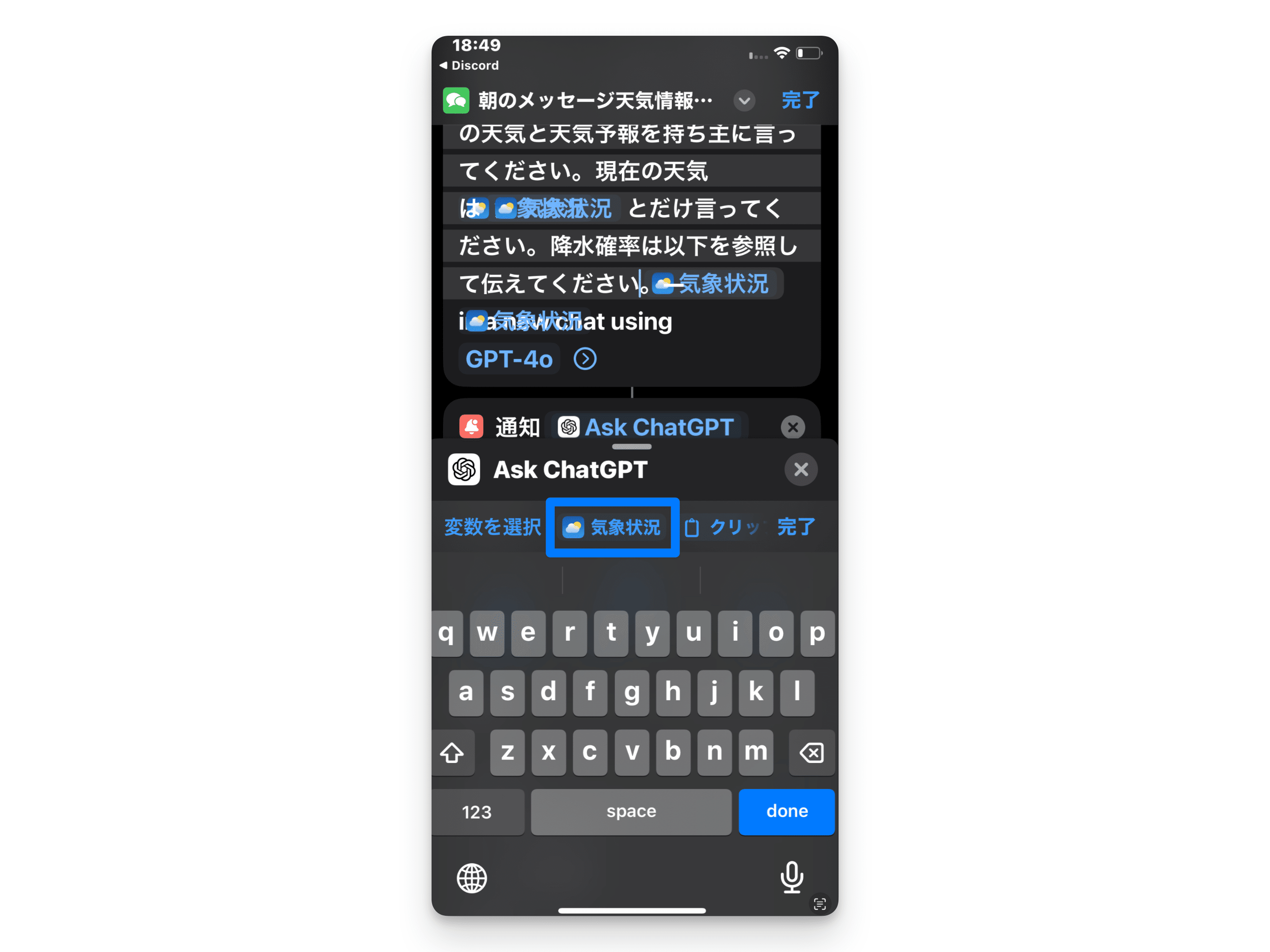 「Ask ChatGPT」アクションのプロンプトを以下のように編集します。{}の部分にはキーボードの上に表示されているバーから「気象状況」を選択して入力します。