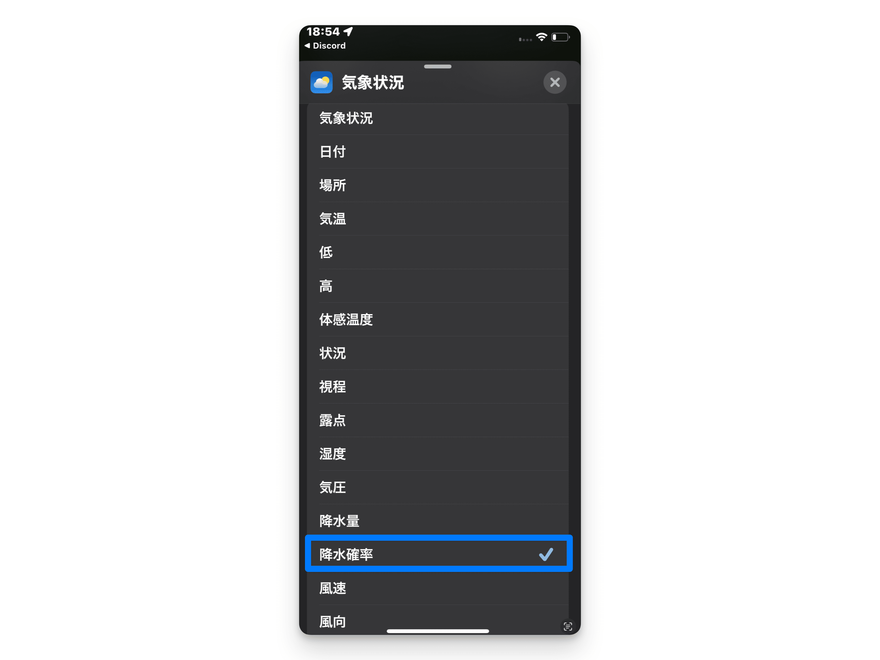 ここで「降水確率」を選択することでChatGPTに降水確率を入力として伝えることができます。