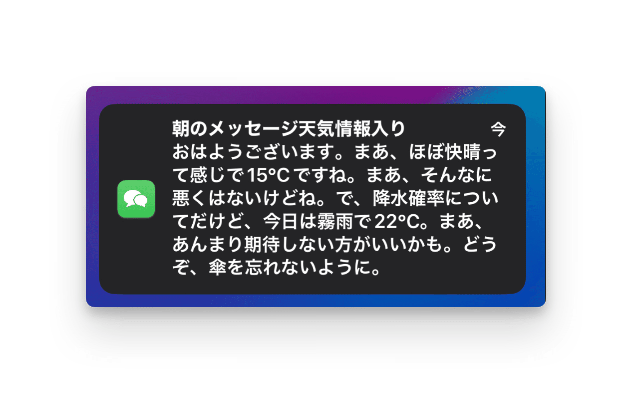 そして、基本編と同様にオートメーションを設定すれば、設定した時間に、以下のような天気情報を含むメッセージが通知されるようになります。