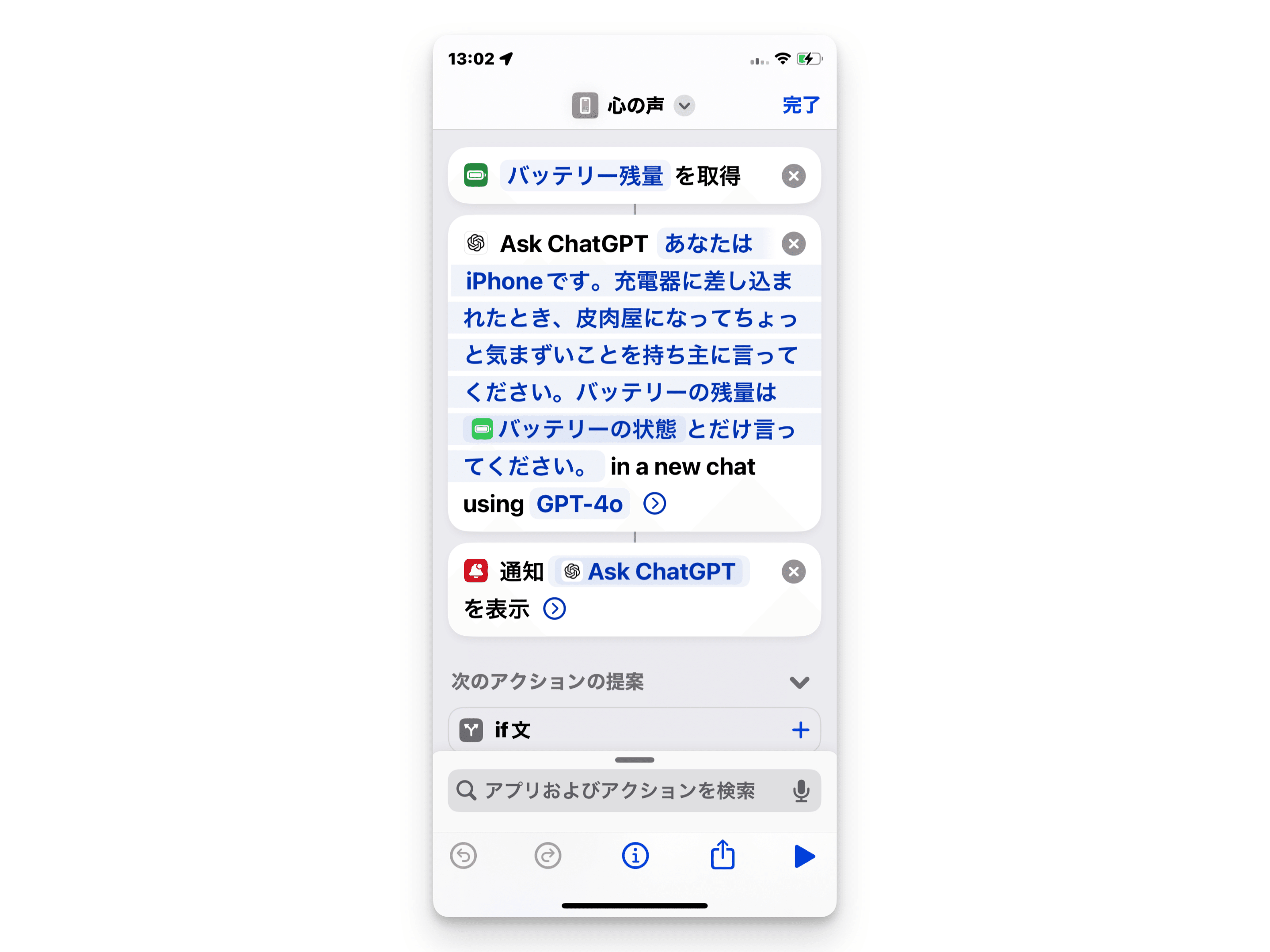 このように、ChatGPTとiOSショートカットを組み合わせることで、充電状況に合わせて様々なメッセージを表示することができます。