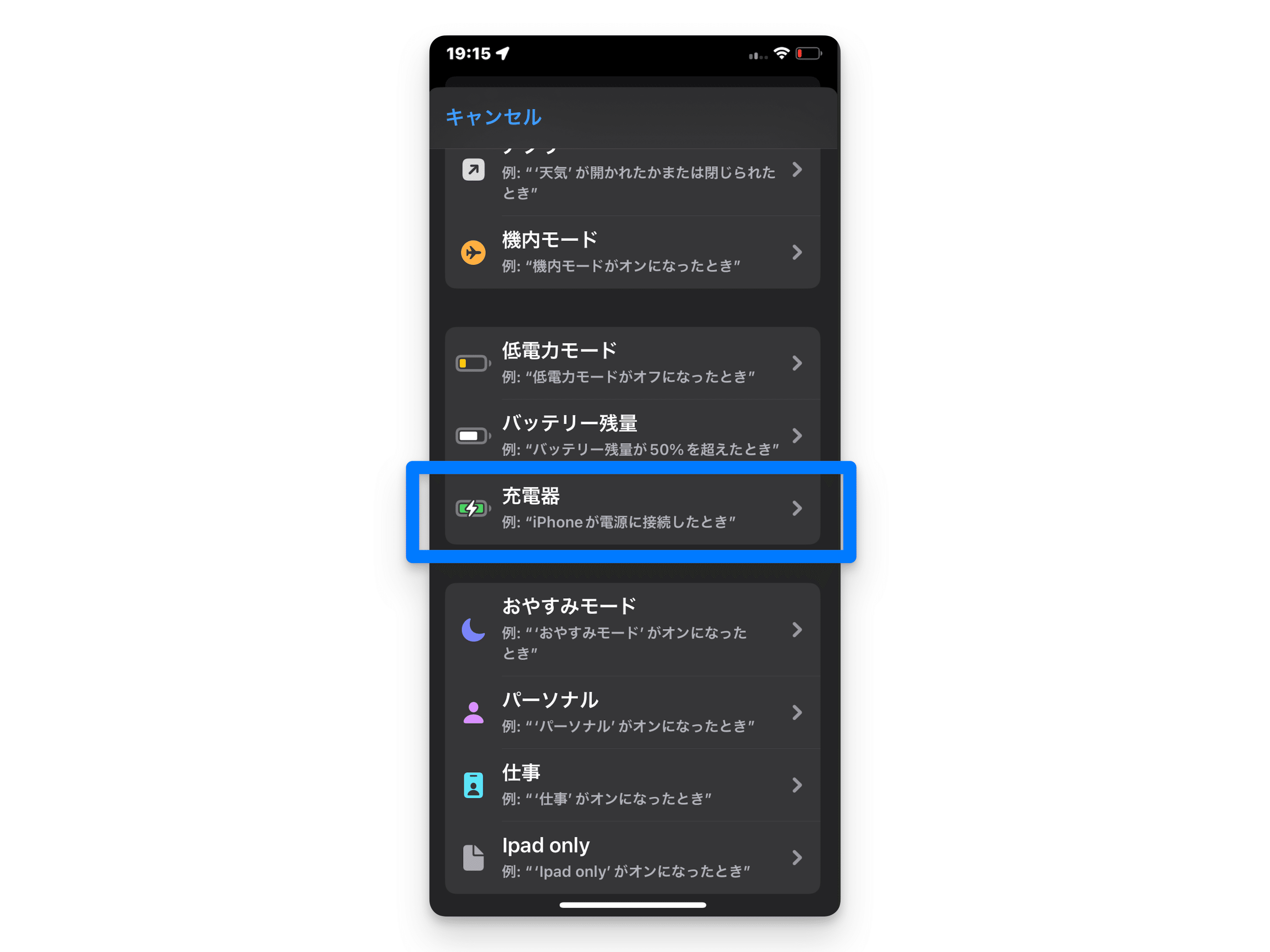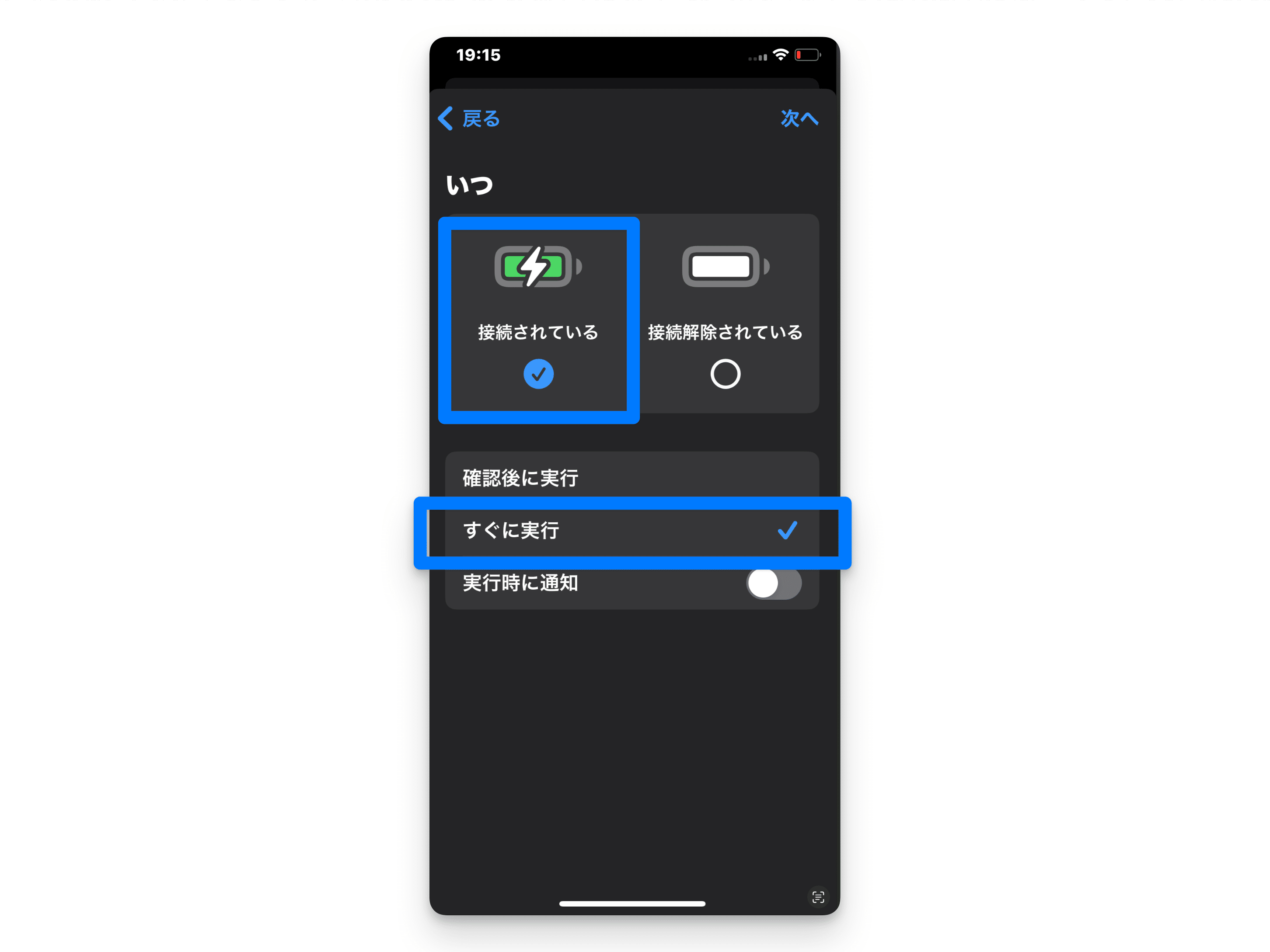 「充電器」を選択し、「接続されている」と「切断されている」のどちらの場合にショートカットを実行するか選択します。今回の場合は、「接続されている」がおすすめです。