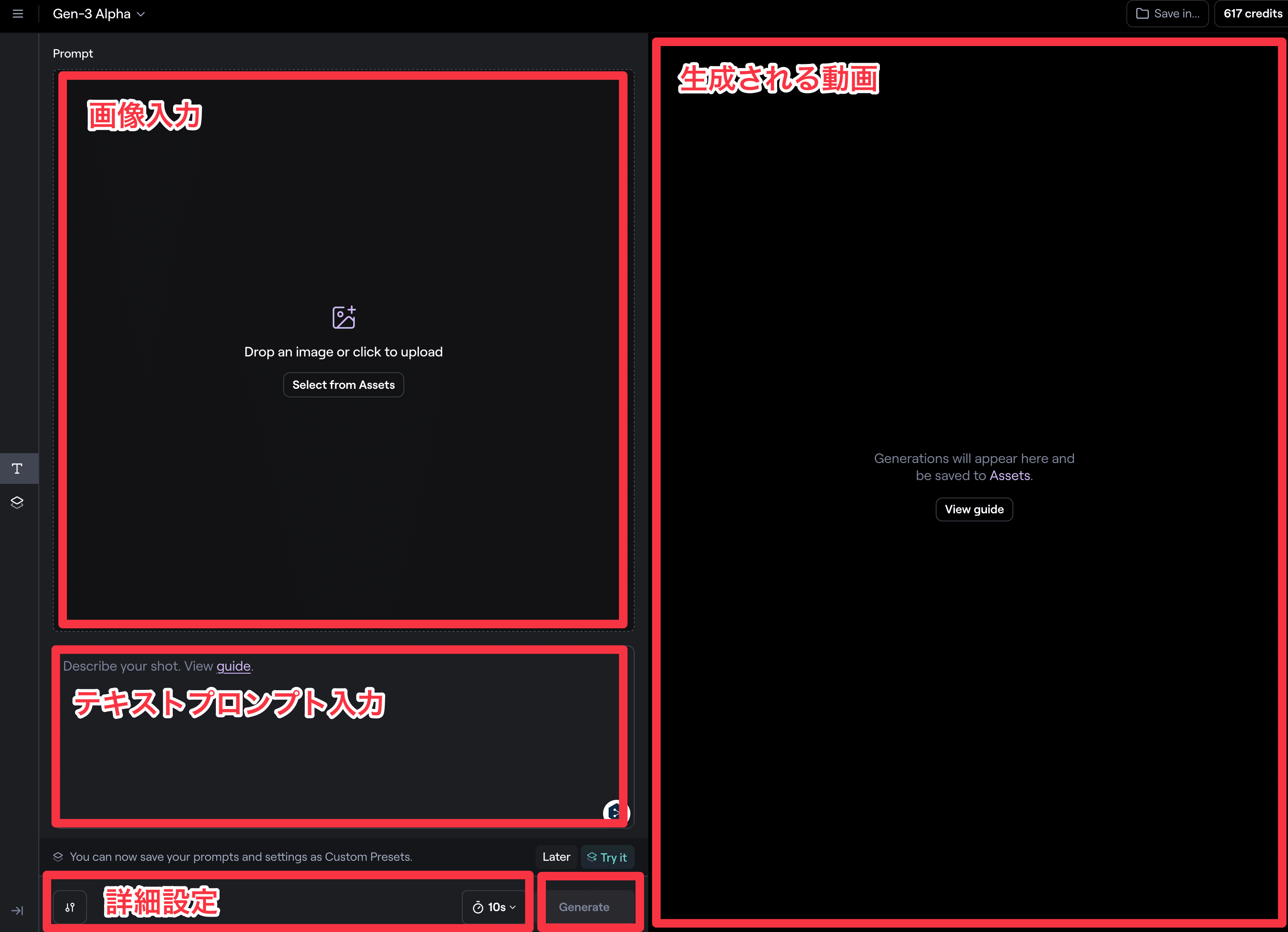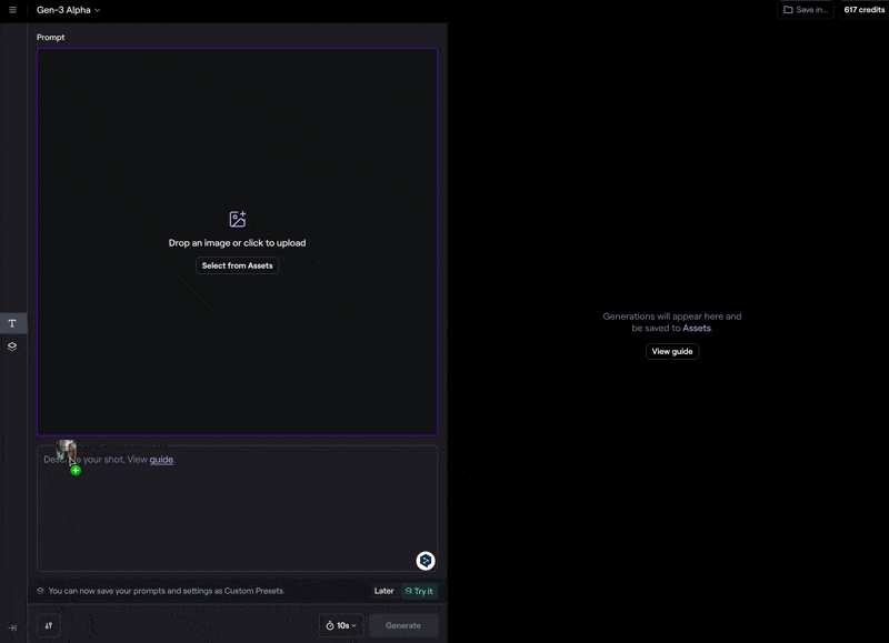 Runway Gen-3のImage to Video機能は、シンプルな操作で動画生成を行うことができます。具体的な操作手順は以下の通りです。