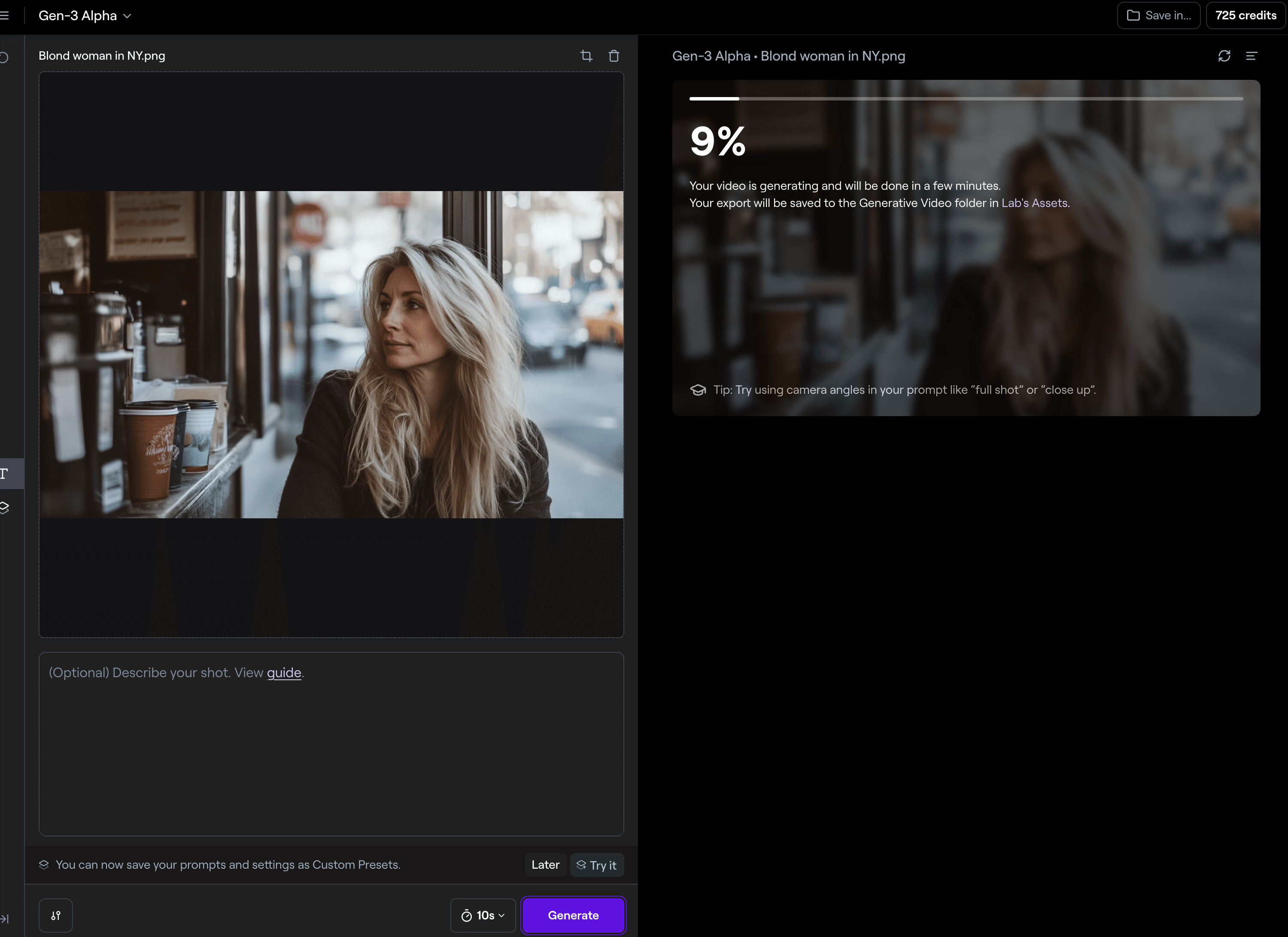Gen-3では、5秒または10秒の動画を生成することができます。その後、「Generate」ボタンをクリックします。すると、AIが画像とプロンプトに基づいて動画生成を開始します。