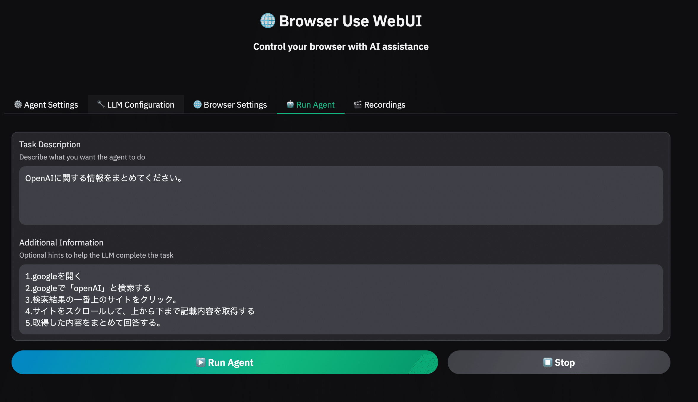 従来のbrowser-useではコマンドライン操作が中心でしたが、このWebUI版では、以下のように操作性が高まっています。