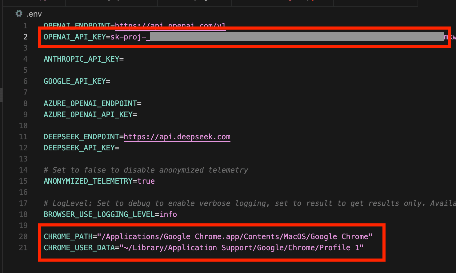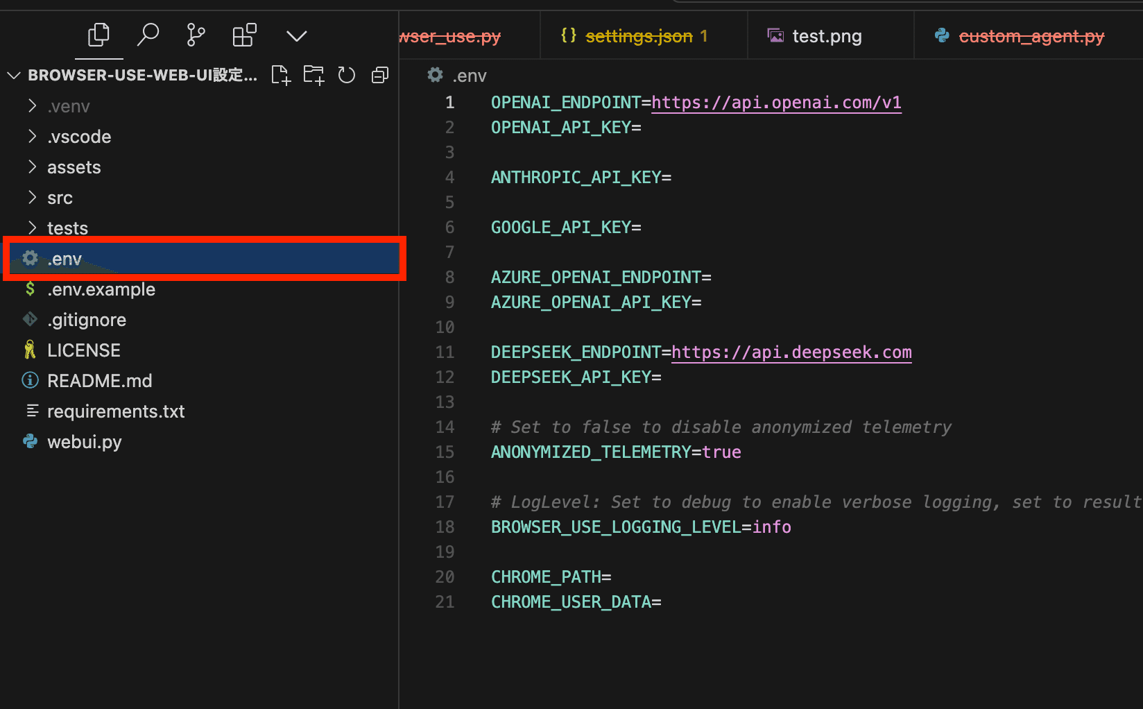 Browser-use WebUIで独自のブラウザプロファイルやAPIキーを使う場合は、環境変数を設定するために.envファイルを利用します。