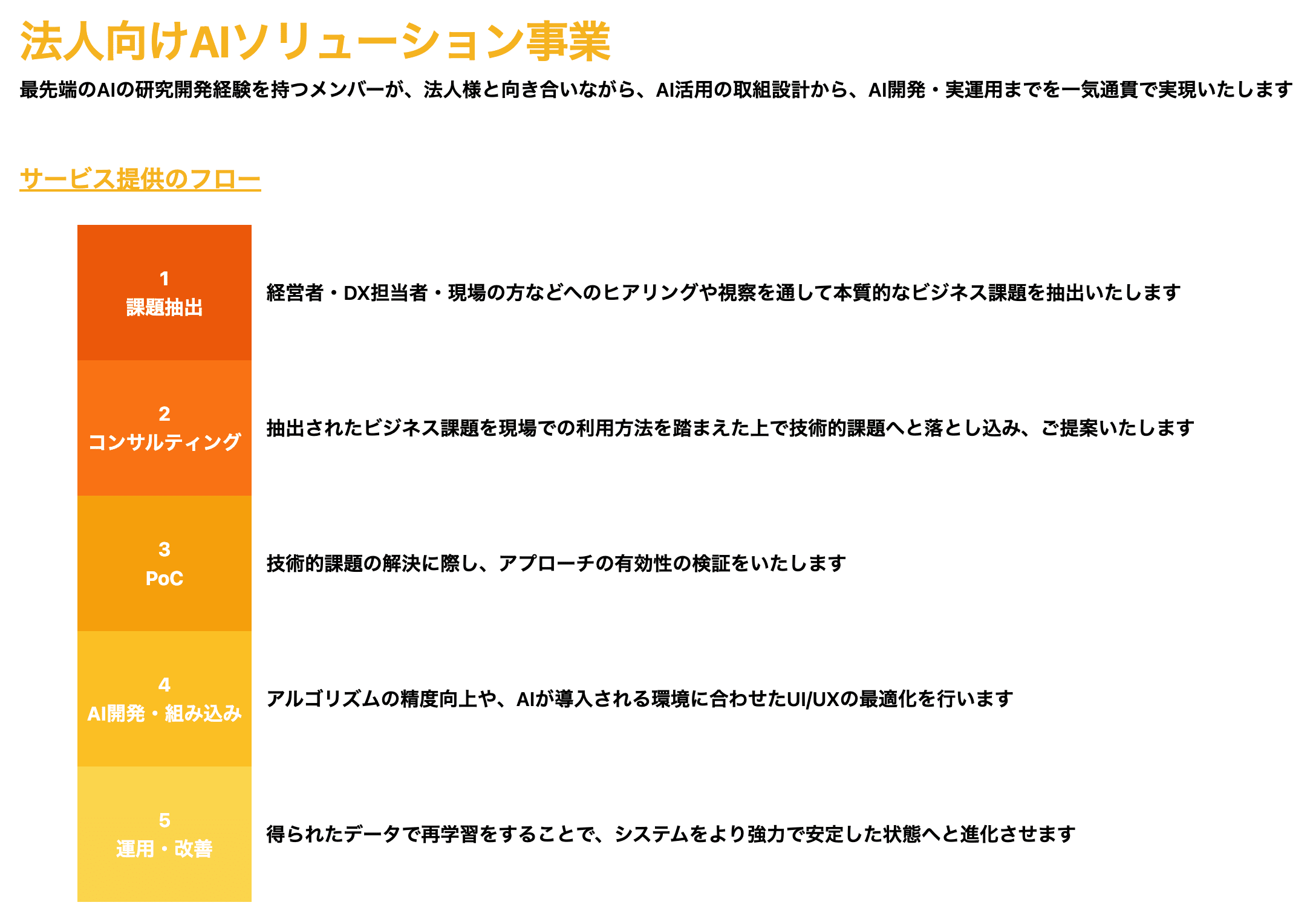 事業内容: 大手企業向けAIアルゴリズム・ソリューションのフルカスタマイズ開発。AI活用の課題抽出・戦略コンサルティングから、PoC、開発・システム組み込み、運用・改善までを一気通貫で提供。
