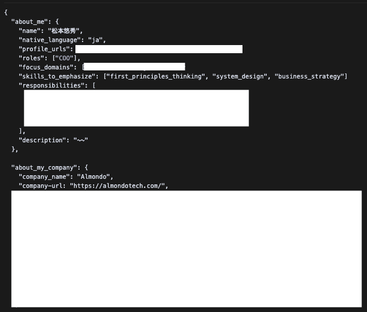 そのために、カスタマイズ機能(カスタムインストラクションやRulesなど)を活用して、あらかじめ自分自身やAlmondoに関する情報を整理して設定しておく、というのを試しています。例えば、僕の役割や得意領域、会社の事業内容や価値観などを構造化して定義しておくイメージですね。