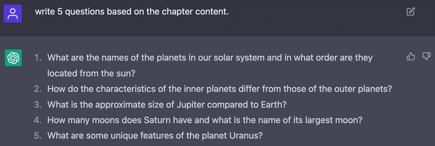 ChatGPTは、コンテンツに基づいたクイズやテスト教材の作成にも利用できます。5年生向けの「地球の探検」の章に基づいた5つの評価問題の例が提供されています。