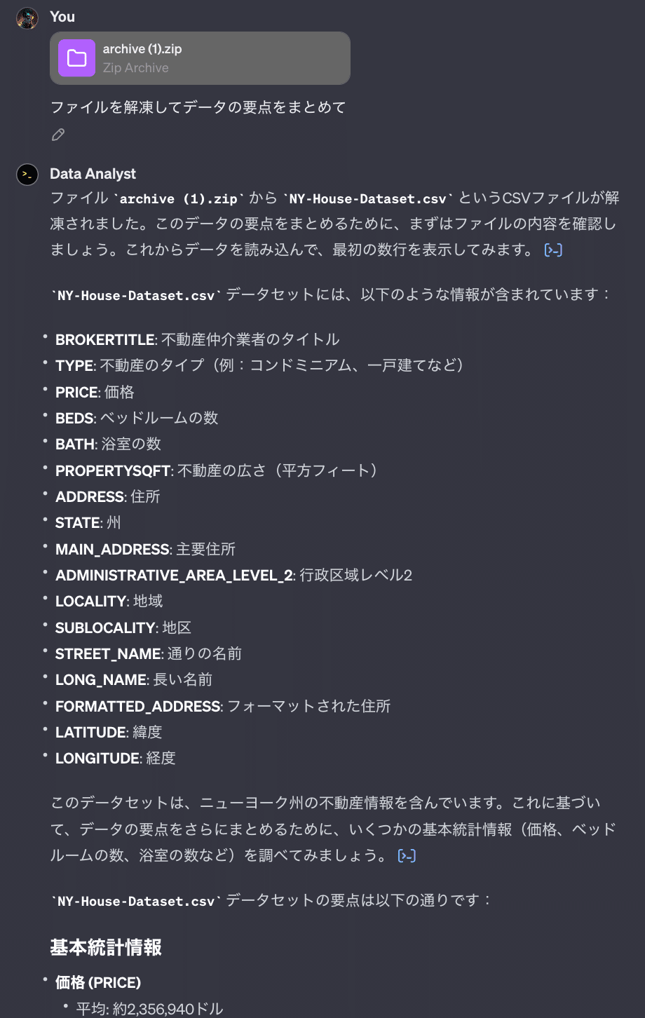以下は、ニューヨークの不動産情報に関するファイルを入力した例です。「要点をまとめて」という簡単な指示で、データ分析から要点をまとめるところまで一気に行ってくれます。
