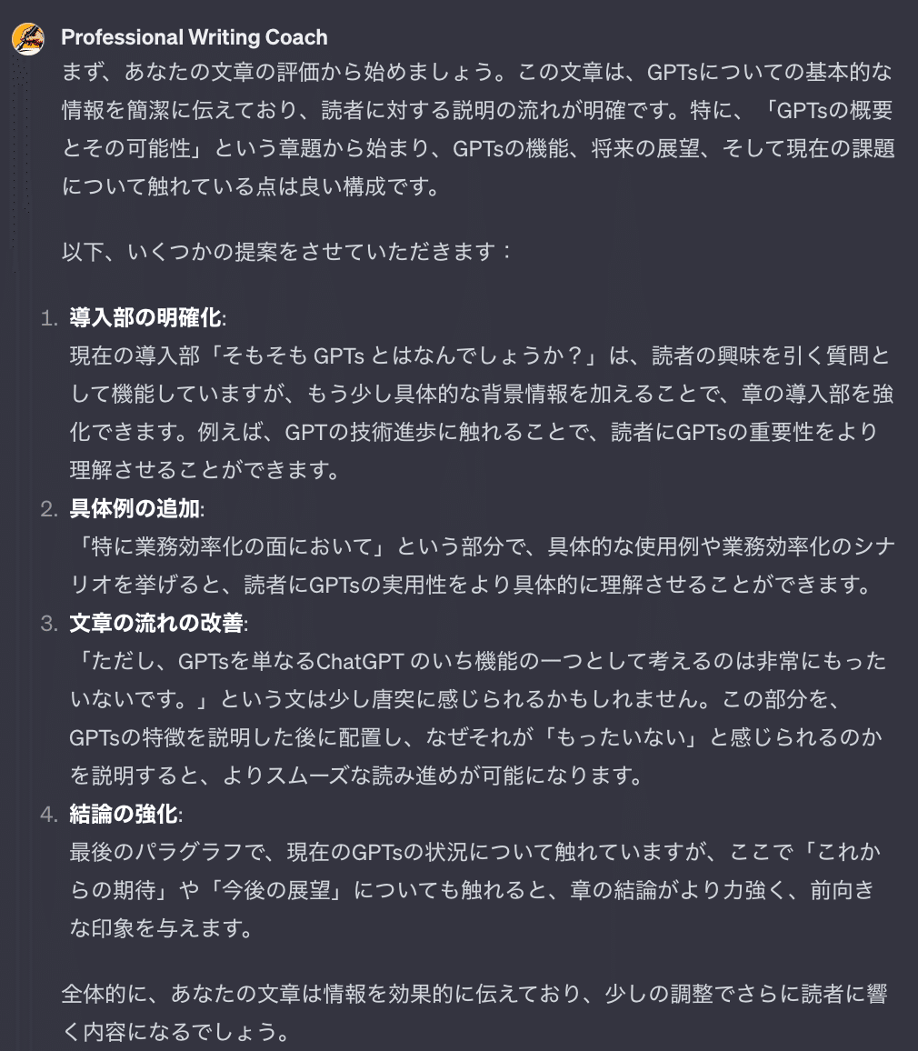 文章をレビューし、改善のためのフィードバックを提供してくれます。実際の出力を見てましょう。画像は以下の文章のレビューをお願いした時の出力です。