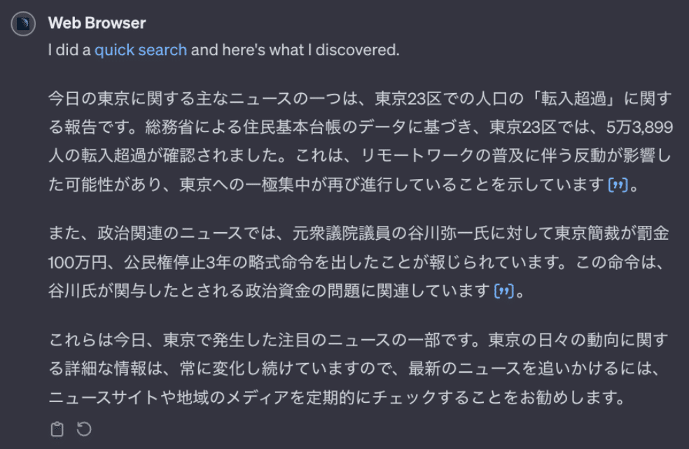 例えば、「東京で起きてる最新のニュースをまとめて」というような指示で以下のような出力になります。