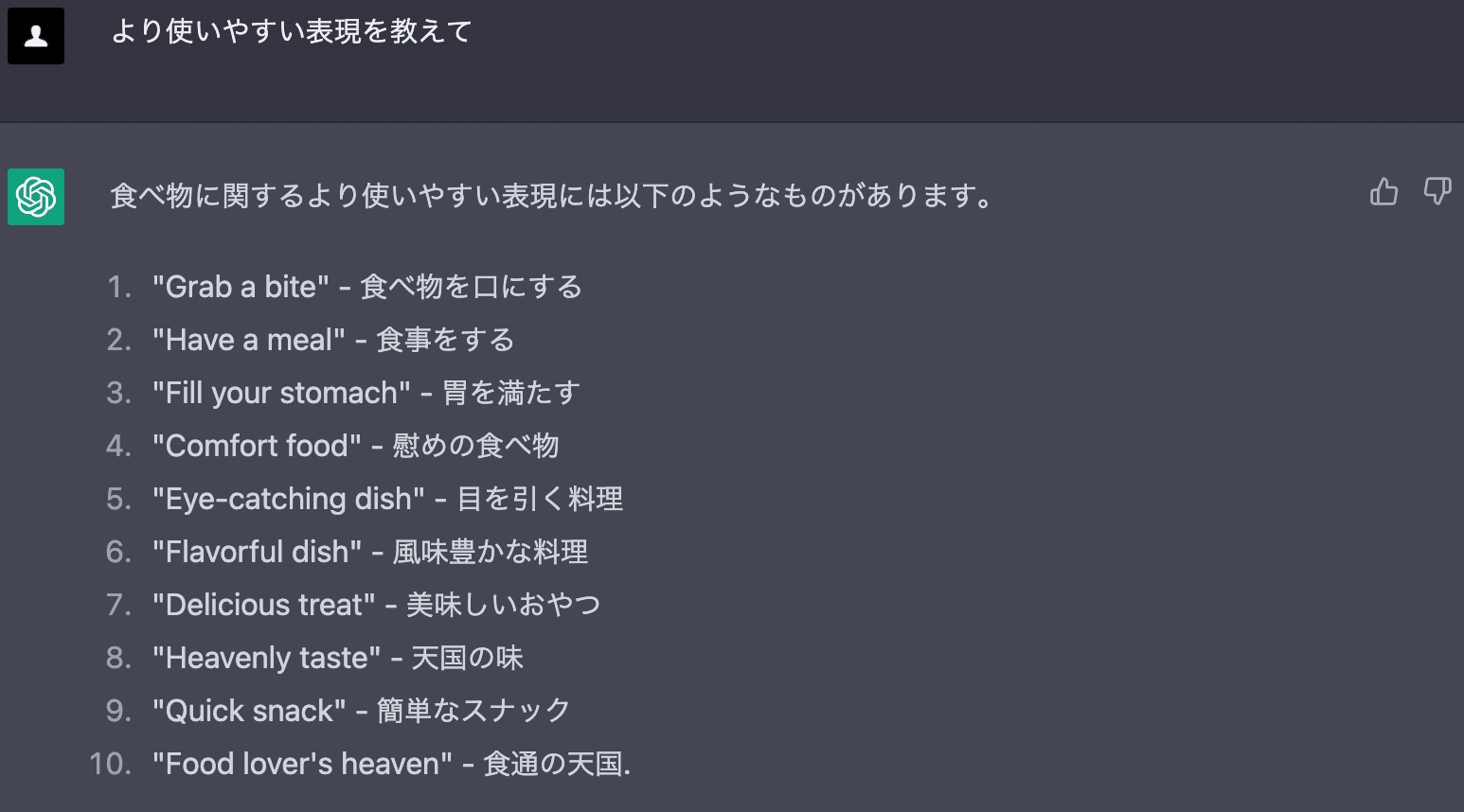 💡Tips: ChatGPTの最大の強みの一つは、ChatGPTが一度出力した内容に、さらに追加で質問できる点です。以下のように「より使いやすい表現を教えて」というような質問ができてしまいます。