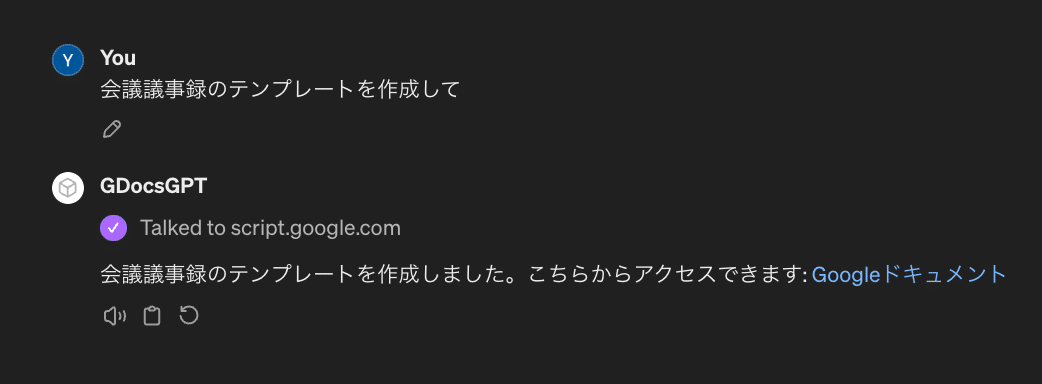 たとえば、「会議議事録のテンプレートを作成して」と指示すれば、GPTが自動で適切な議事録テンプレートを生成します。例えば、以下のようにGoogle DocumentのURLを共有してくれます: