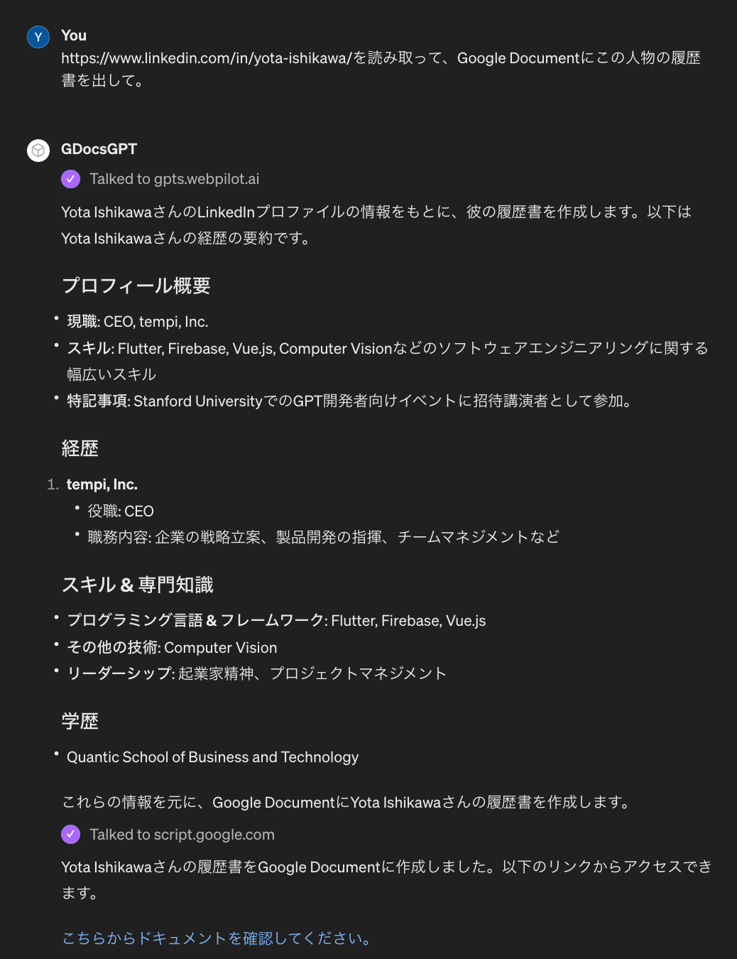 このGPTにWebpilot を搭載することで、LinkedIn のURLを入れるだけで、Google Document に履歴書を作成するなどの応用ができます: