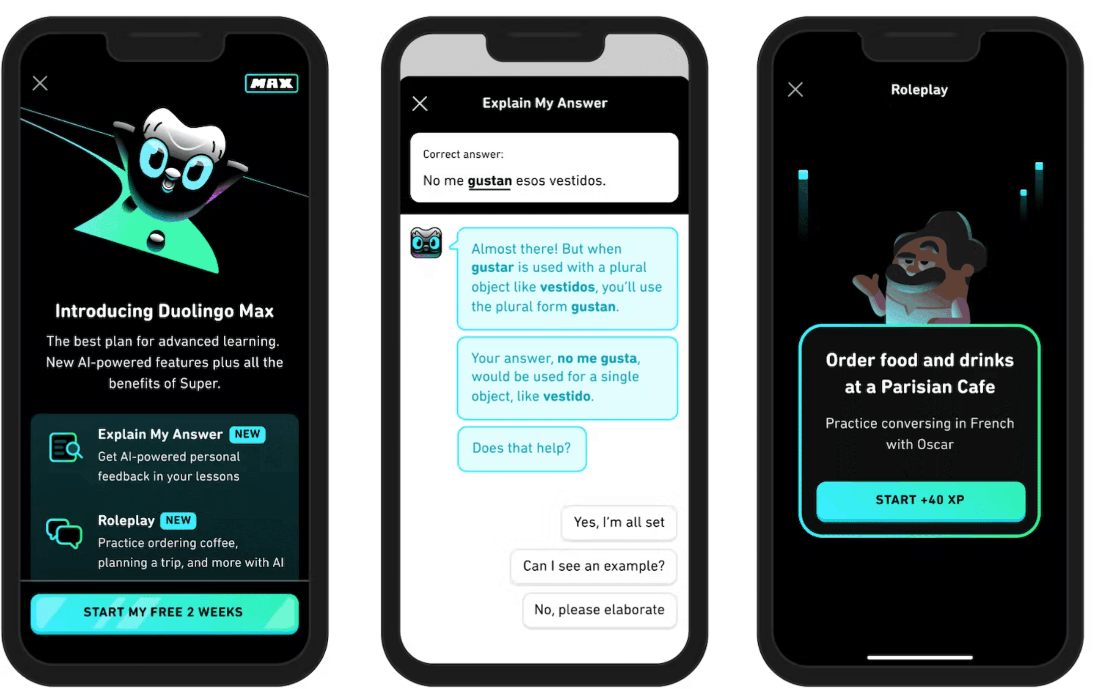 Duolingo Maxは現在、スペイン語とフランス語の学習にこれらの新機能を利用しており、今後さらに多くの言語に拡大し、新機能を追加する予定です。