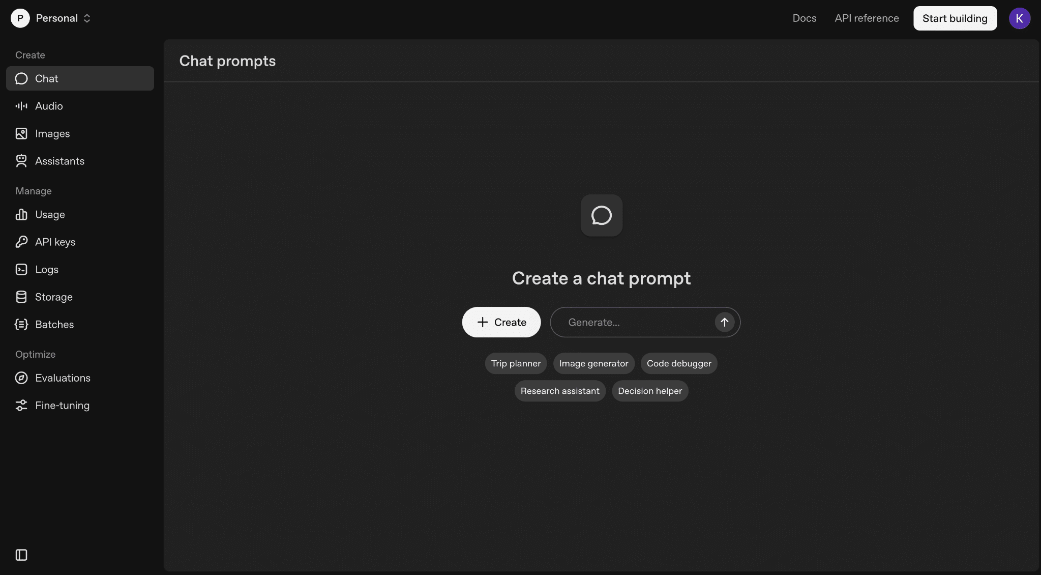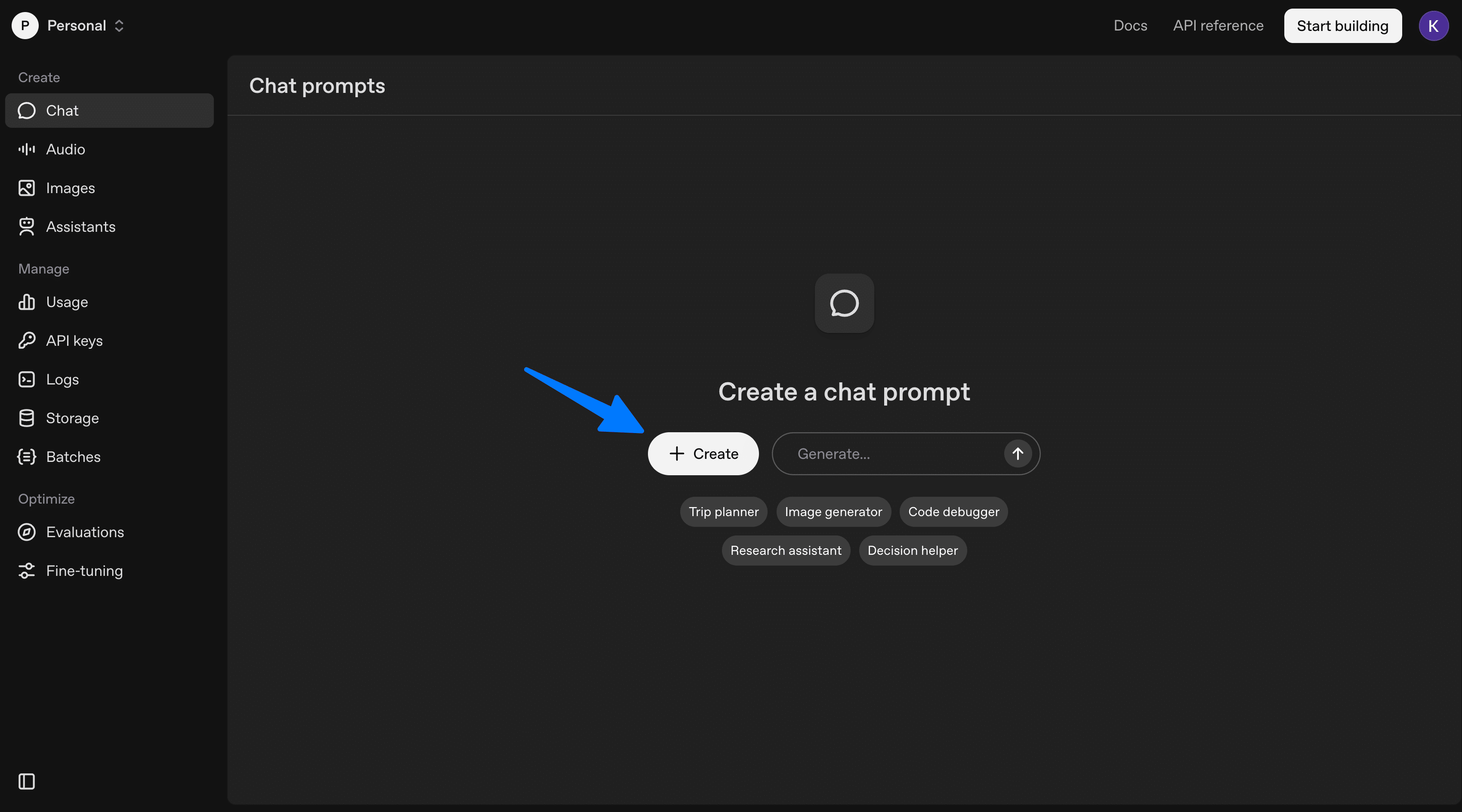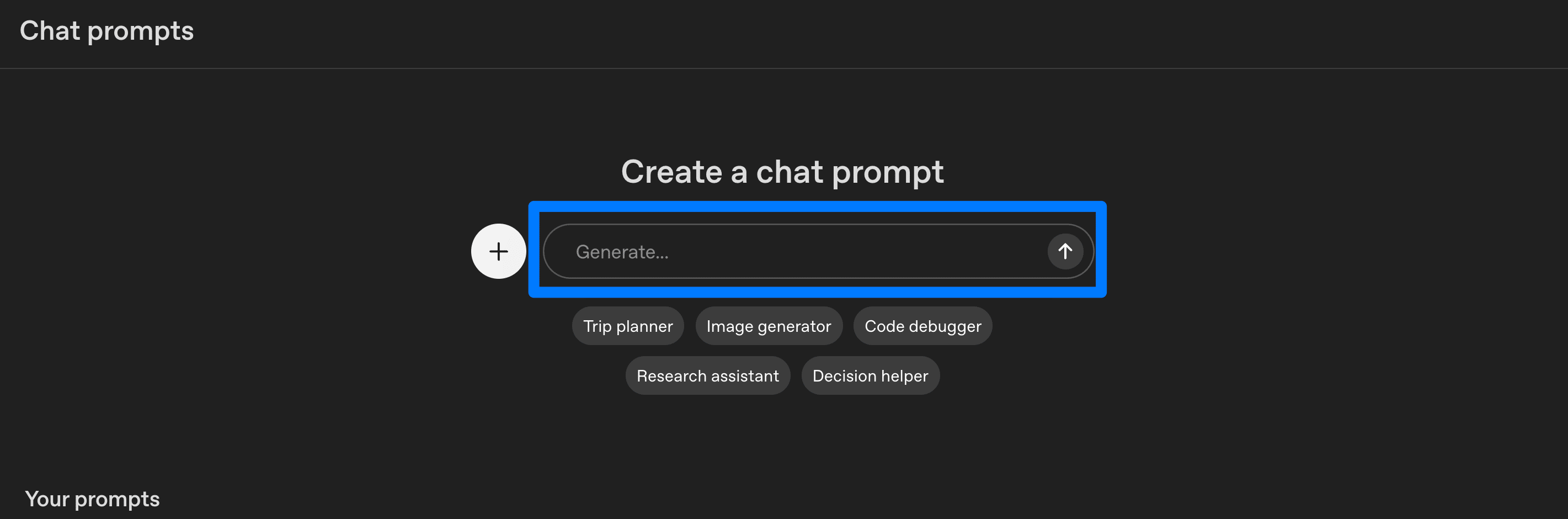 プロンプトを作成するには、中央の「+ Create」ボタンか、「Generate…」に自然言語で入力して始めます。