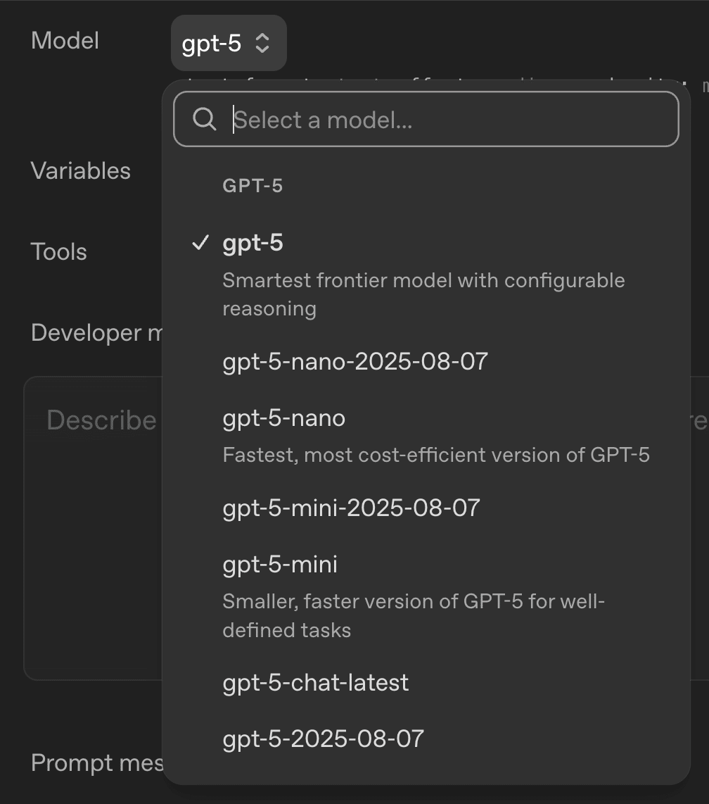 Modelセレクタ: gpt-5など、使用するモデルを選択します。