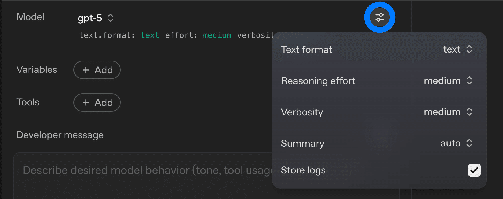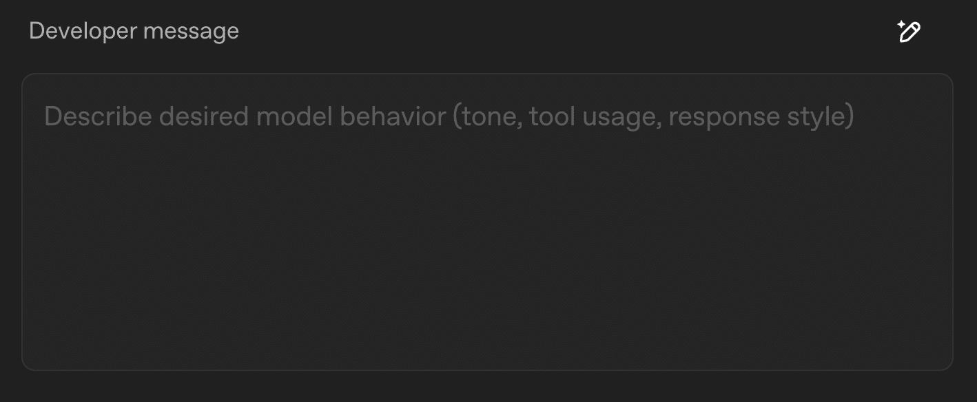 Developer message: 従来の「 System message」に代わる、AIへの最上位の指示です。AIの役割やトーン、ツールを使う際のルール、出力形式の指定など、基本的な振る舞いをここで定義します。